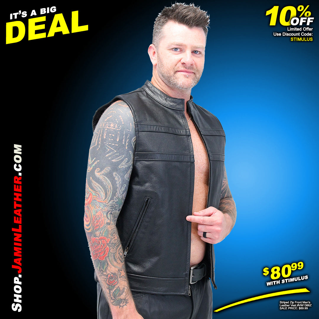 View this post on InstagramIt's A Big DEAL. Striped Zip Front Men's Leather Vest #VM1366Z - ON SALE $80.99 With Code: STIMULUS