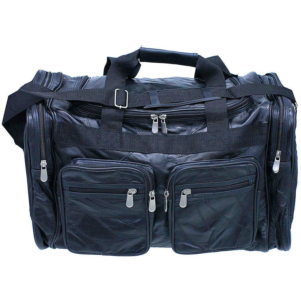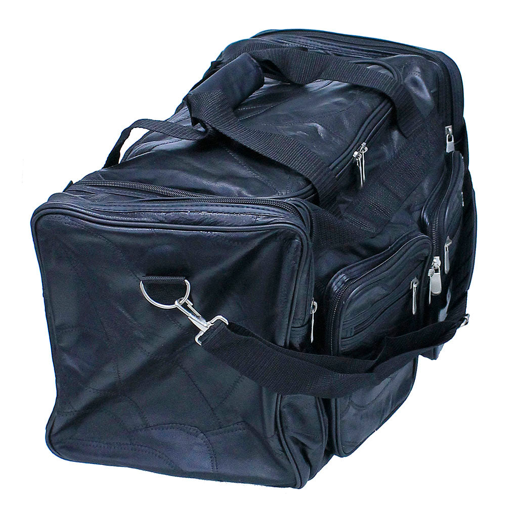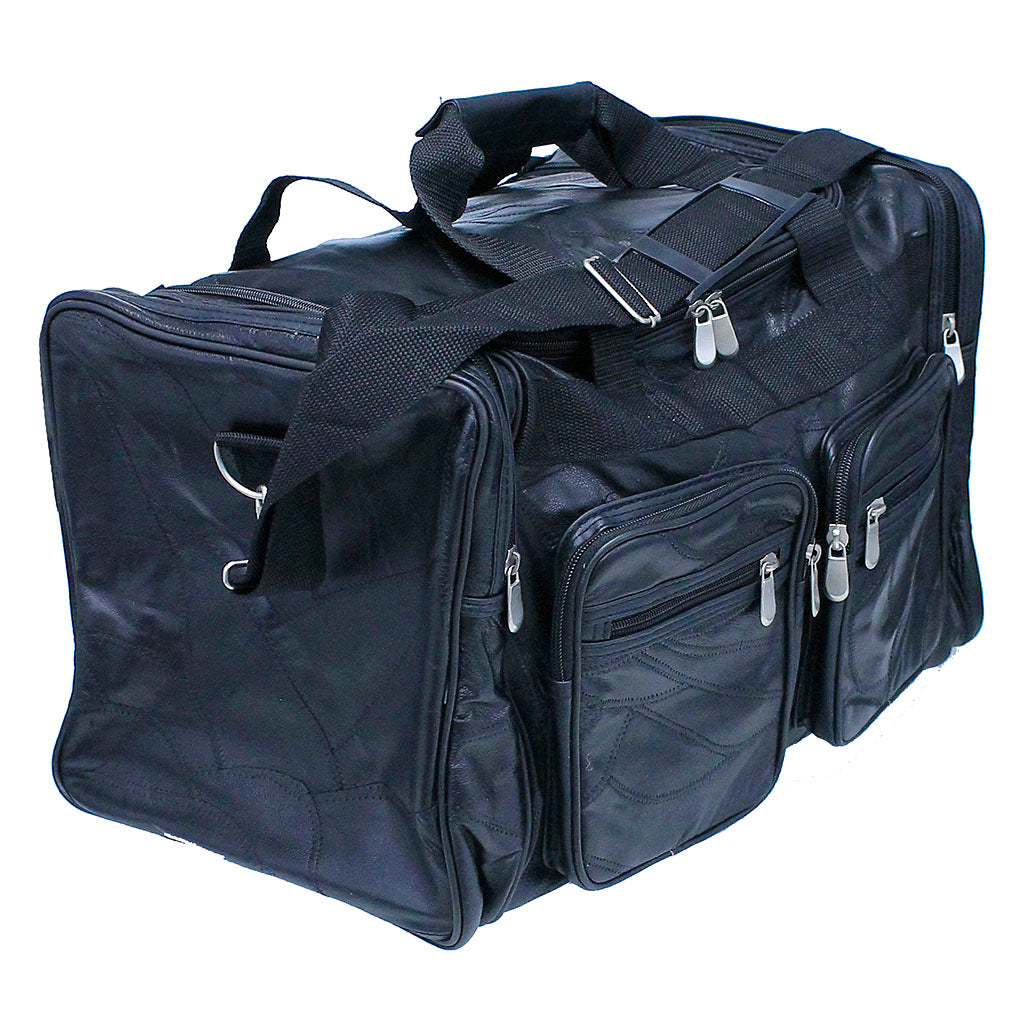 Extra large leather duffel bag that comes with a top zipper for the large main compartment, small zipper pocket inside, soft nylon lining, three front compartments, one with a clasp flap and two zippered, two side zipper compartments, one with a shoe gusset, double top handle with Velcro wrap to keep handles together and a removable nylon shoulder strap with rubber shoulder pad for comfort. An ideal travel bag for long trips away from home, great for the gym or your work clothes. [5#]