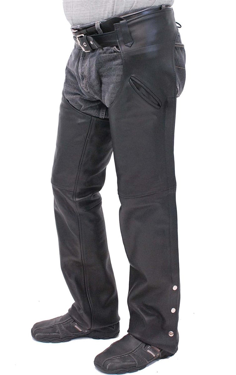 Motorcycle chaps in premium quality buffalo leather with two easy access slash pant pockets. These leather chaps come with a soft nylon lining, adjustable lace back, adjustable front belt, YKK zippers and snap cuff bottom that makes it easy to trim with household sheers. These incredibly comfortable leather motorcycle chaps are made of soft and comfortable 1.3-4 mm thick premium buffalo leather. Quality unisex leather harley chaps for men and women! Sizes: S, M, L, XL, 2X, 3X, 4X, 5X, +$10 for 2X-3X, +$20 for 4X-5X. [5#]