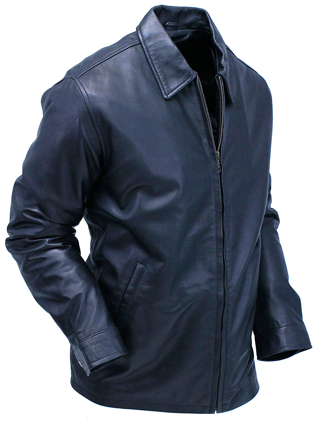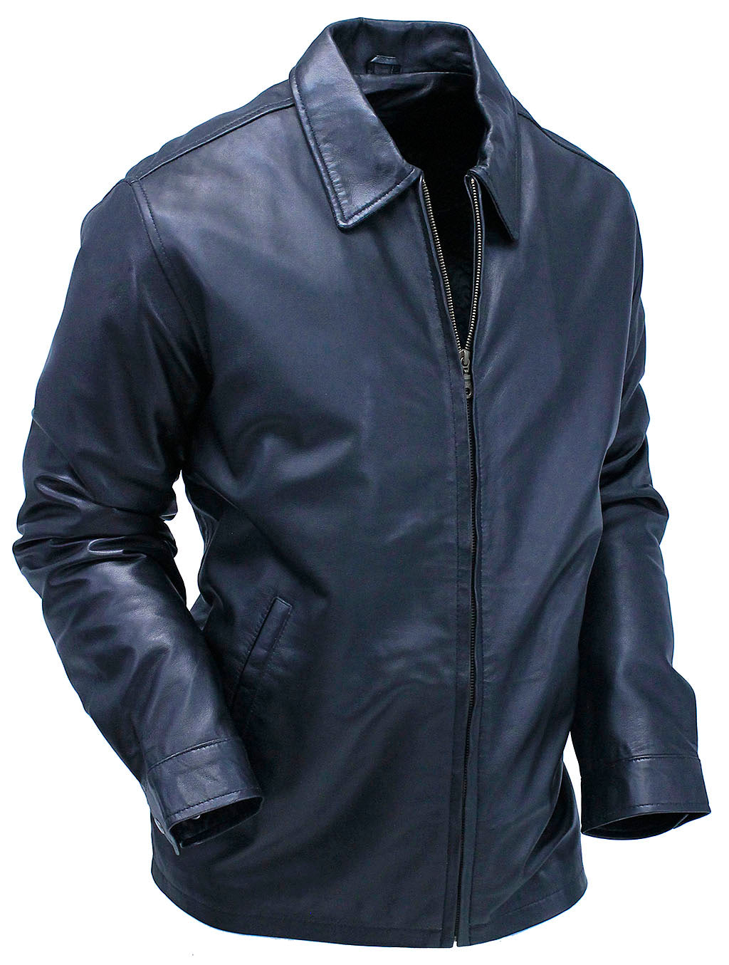 All American classic men's lambskin jacket. Rebel without a cause leather jacket for that sophisticated man that wants nothing but the basics to look good and always stay in fashion. A men's classic lambskin leather jacket with a zip out lining, 2 front pockets, shirt collar, snap cuffs, 1 inside cell phone pocket, 1 zippered inside chest pocket, 1 inside vertical entry pocket and a satin quilted zip out lining that feels as good as it looks. Exclusive Jamin Leather® quality brand. Sizes: M, L, XL, 2X, 3X. +$10 for 2X-3X. [7#]