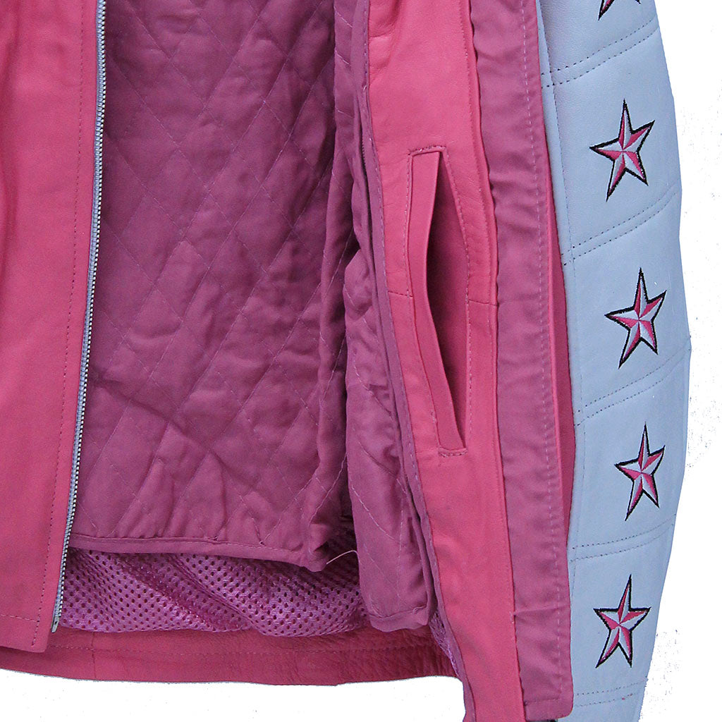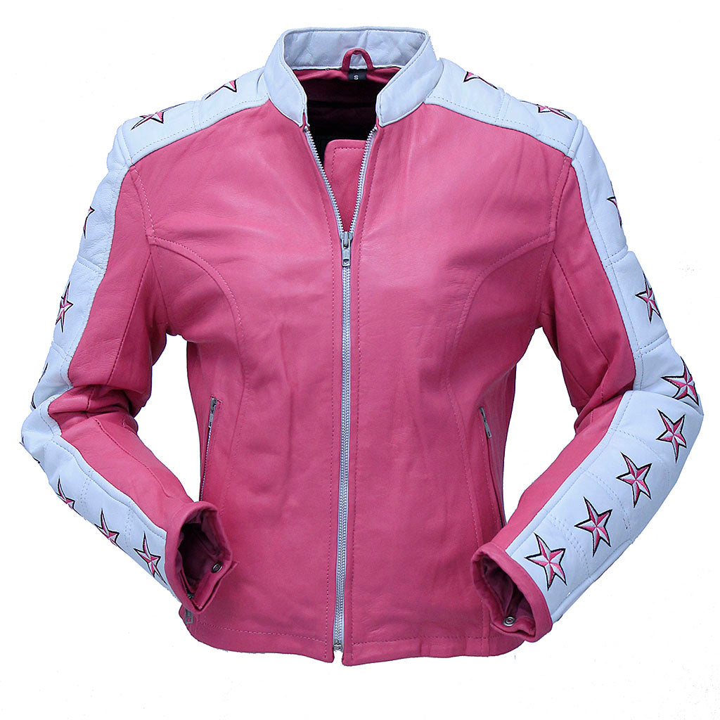 Pink leather jacket for women in a cafe racer style. This women's leather jacket is on sale at an unbelievable low sale price. A women's motorcycle jacket with a mandarin collar made of soft buffalo leather with a star filled stripe from one arm to the next. This bargain priced coat comes with zip front pockets, zip cuffs to keep the wind out, a vertical inside chest pocket, and a full sleeve zip out lining for cool weather riding. Made of unbelievably soft premium top grain buffalo leather sale priced jacket. Sizes may run small. Sizes: S, M, L, XL. 2X, 3X. +$10 for 2X-3X. [6#]