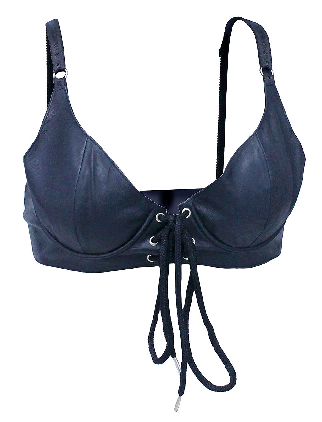 Alluring lace up leather underwire bra made of ultra soft and comfortable black lambskin leather. This lace up underwire leather bra has adjustable back strap and adjustable bra straps for that perfect fit. Ideal as outerwear or underwear, you choose! Sizes: S (30-34 bust), M (32-36), L (34-38), XL (36-40). [1#]