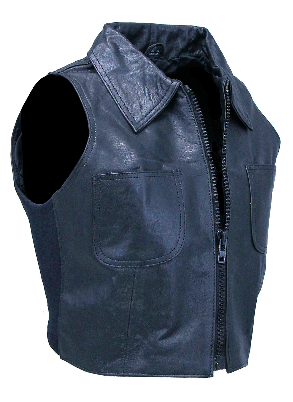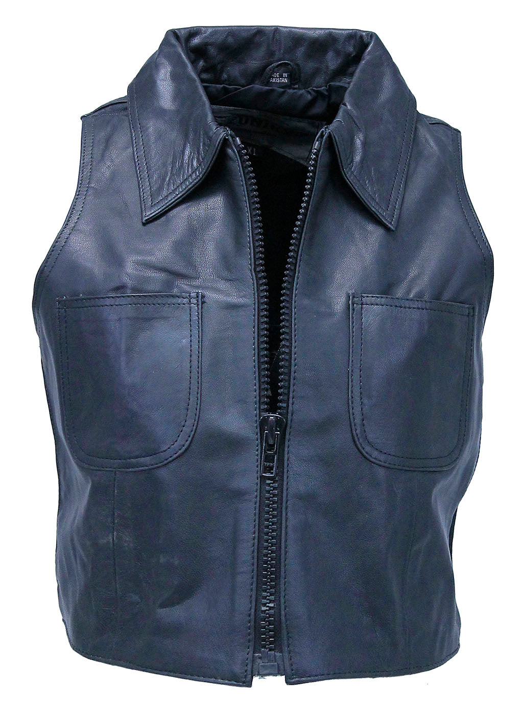 Classy looking leather crop top with full front zipper that is on sale at an amazing price. This cropped leather vest is made of soft goatskin or cowhide leather and comes with a shirt collar, two chest pockets and a soft nylon lining. Also comes with a 2" elastic stretch sides for more of a form fitted look. Ideal vest to show off you body jewelry or sexy mid-drift. A real eye-catcher. Comes with a full length front zipper and a one piece leather back for optional club patches. Size may run small. Sizes: M, L, XL, 2X. +$6 for 2X. [2#]
