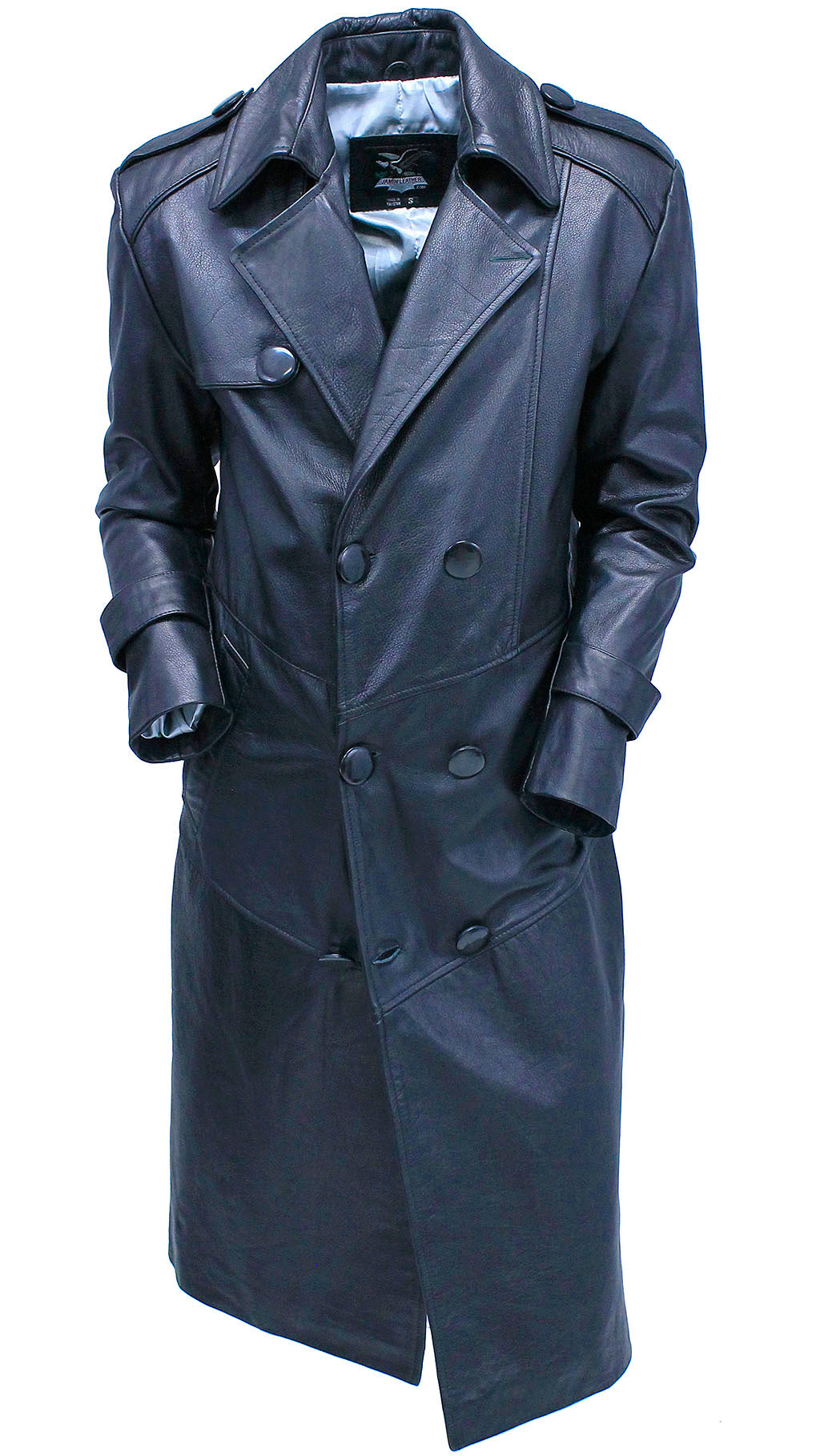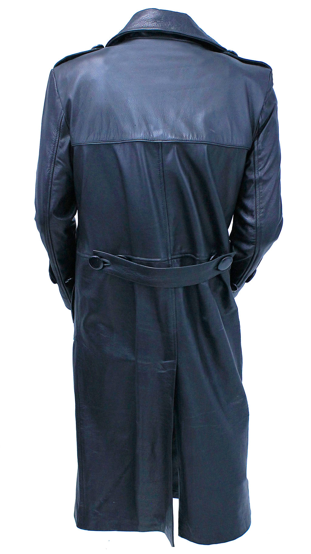 Men's double breasted updated leather trench coat. A long leather coat for men made of premium soft top quality, top grain, ultra-premium cowhide leather. This leather overcoat comes with a bendable top collar to shape as desired, large notch collar, cuffs straps, oversized front buttons, light polyfill satin lining, two front pockets, dual inside concealed chest pocket with barrel loops inside, epaulets, decorative and adjustable back belt, and a partial cape style Jamin Leather® original design. Sizes: S, M, L, XL, 2X, 3X, 4X, 5X. +$20 for 2X-3X, +$40 for 4X-5X. [7#]