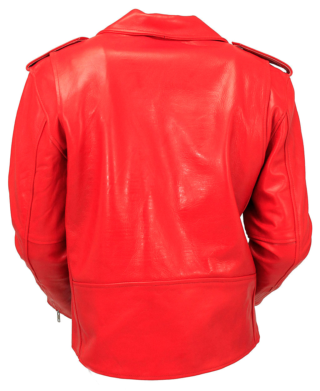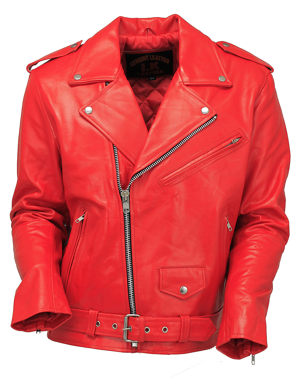 Men's Red leather motorcycle jacket with all the classic features. This red leather jacket has 3 front zippered pockets, adjustable belt, asymmetric front zipper, snap down lapel, snap down epaulets, quilted lining, bi-swing shoulders for better reach, and zip cuffs to keep the air out. Sizes: 42, 44, 46, 48, 50, 52, 54. +$10 for 48-52, +$0 for 54-56. [7#]