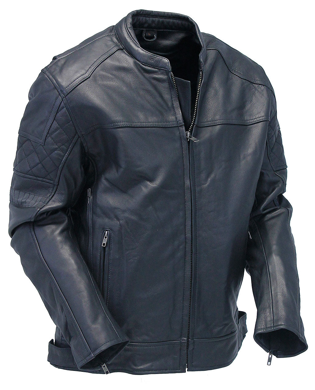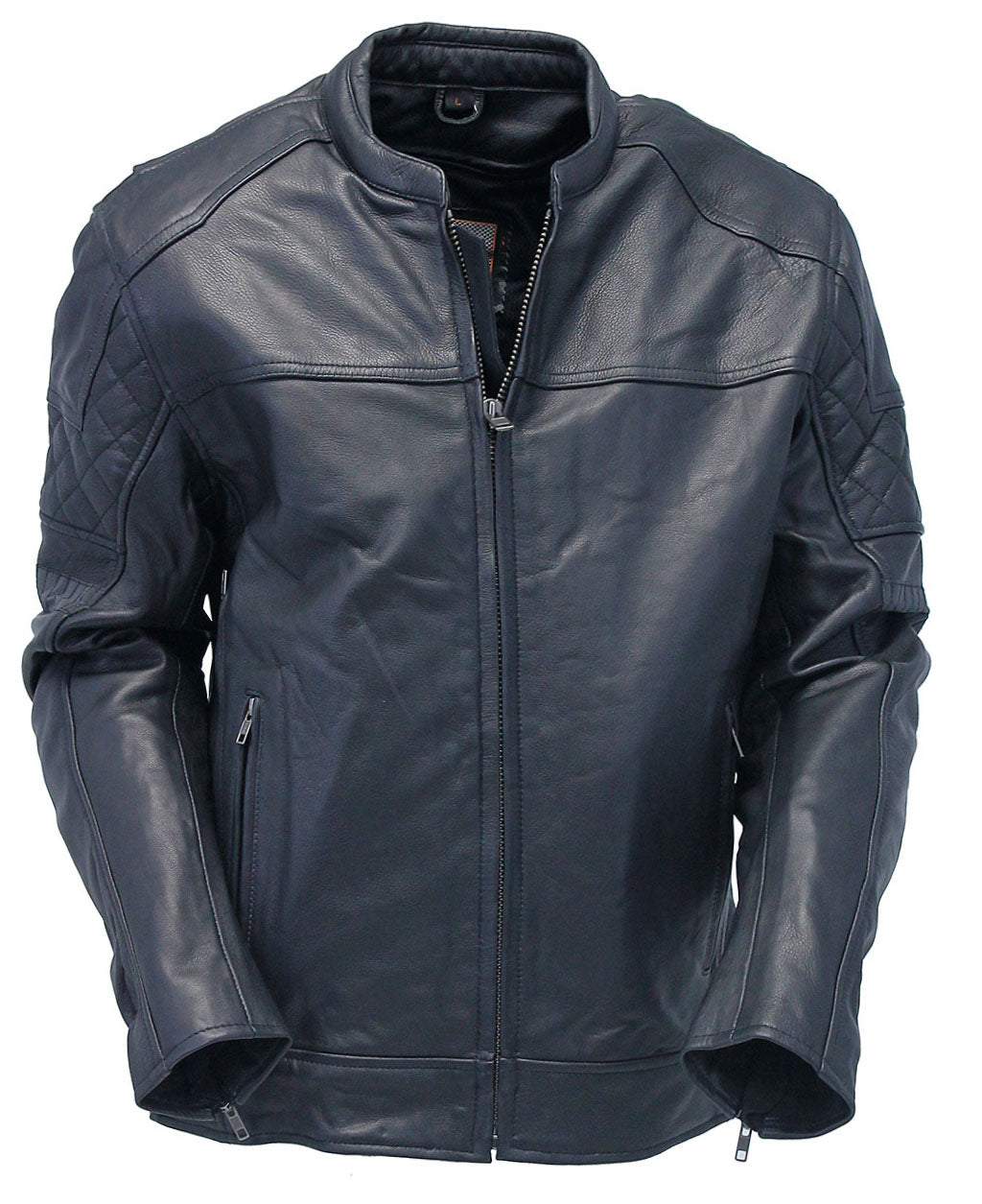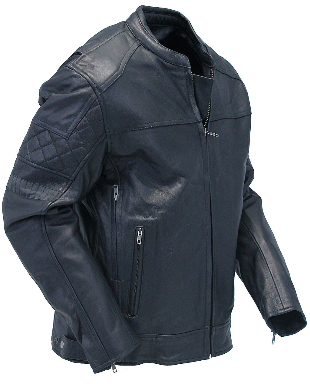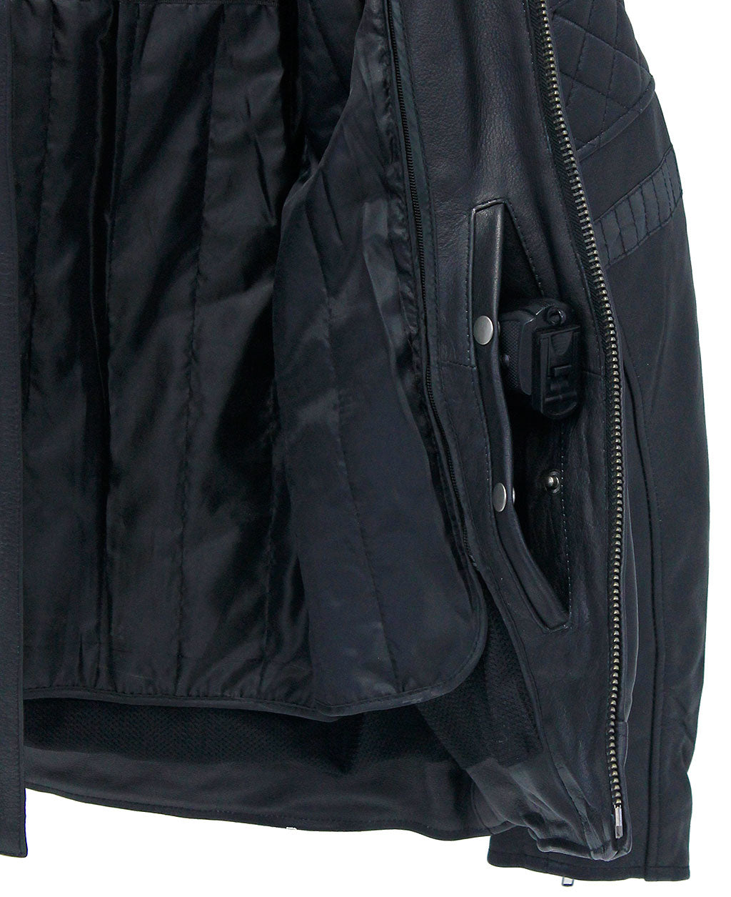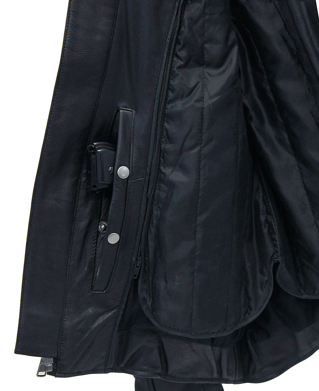 Men's concealed carry leather jacket in a motorcycle scooter style with venting and reflector patches on each arm just below the quilted leather panel. This Concealed Pocket leather vented motorcycle jacket is made of Ultra Premium black cowhide leather. Comes with dual inside concealed pockets with barrel loops inside each to keep that device in place, front side zip vents, vertical back side zip vents, adjustable waist side snap tabs, zip front pockets, zip cuffs to keep the wind out, heavy duty antique hardware, bi-swing shoulders for improved reach, and a full sleeve zip out lining. This Concealed Pocket armored jacket is an ideal 4 season riding jacket and made of top grain Ultra Premium cowhide leather. Sizes: M, L, XL, 2X, 3X. +$10 for 2X-3X. [7#]