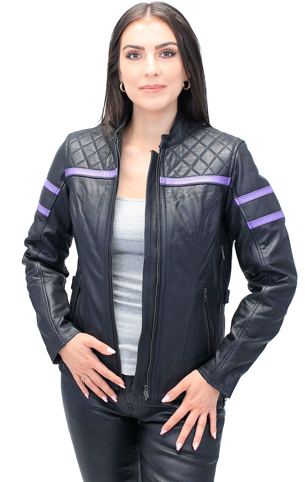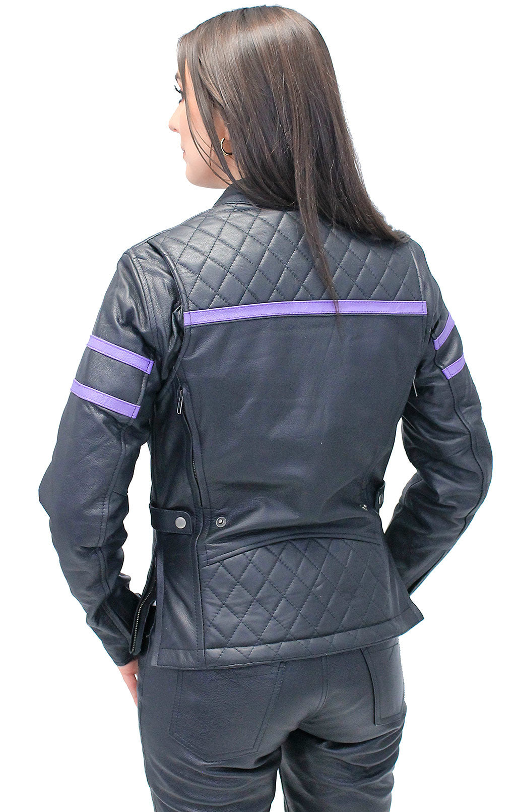 Women's vented motorcycle jacket with purple stripes and quilted shoulders. This purple leather jacket with vents is made of premium cowhide leather. A great looking women's biker jacket with front and back zipper vents, bi-swing shoulders for added reach, dual inside vertical concealment pockets, two side zippers so the jacket won't ride up when sitting, mandarin collar, zippered front pockets, zippered cuffs to keep the wind out, a soft nylon and mesh lining underneath the zip out lining. A great new look for the lady rider. Sizes: S, M, L, XL, 2X, 3X, 4X, 5X. +$10 for 2X-3X +$20 for 4X-5X. [6#]