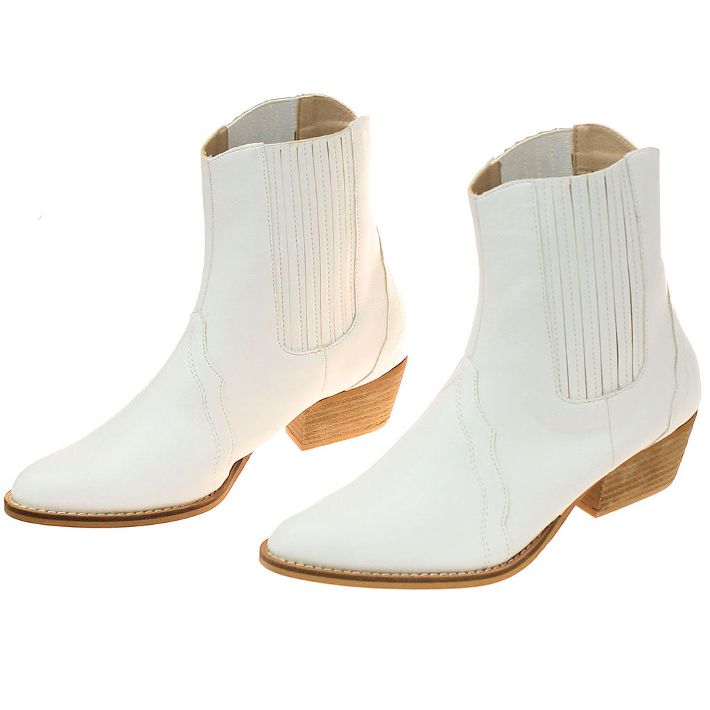 Women's white ankle boots with elastic pads on each side for slim fitting comfort and a 1.5" cowboy heal. Great looking classic boots that comes with a cushioned insole, and made of soft leather-like pvc material. Sizes 5.0-10.0 [4#]