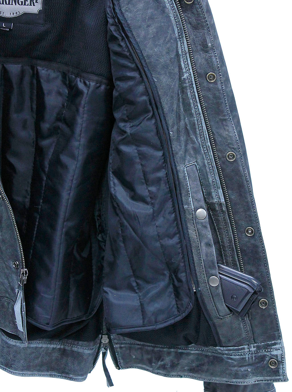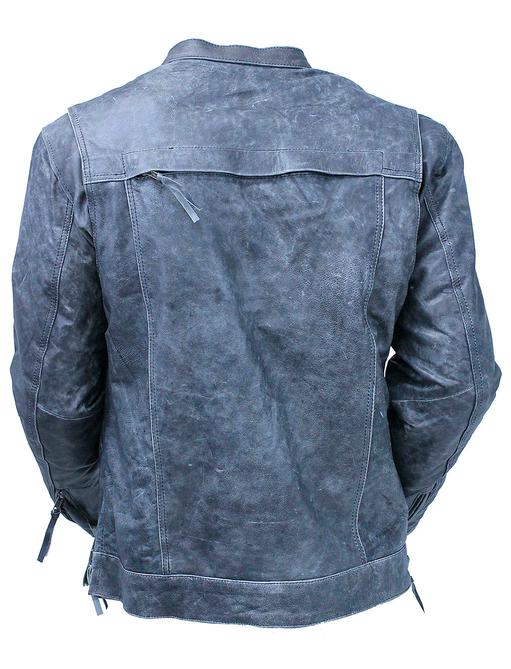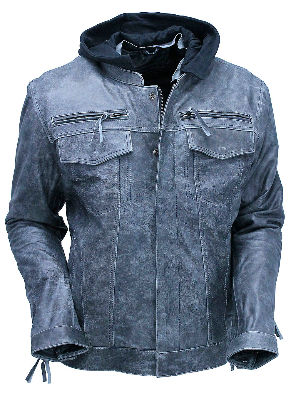 Men's gray leather jacket with hood that is removable. This men's vintage gray leather hoodie is not only a motorcycle jacket with hood but a new classic. A soft lambskin leather motorcycle jacket with hood and dual hidden concealed carry inside pockets, and zipper vents on front and back. The soft lambskin leather is comfortable and lightweight. Other premium features include hidden front snap heads under the leather, side zippers for sitting comfort, zip and snap cuffs to keep the wind out, rounded mandarin collar, a zip off cotton hood, two snap down lower front pockets, two snap flap chest pockets, full sleeve zip out lining, full front hidden zipper with snap flap cover, two chest zipper vents, horizontal back zipper vent and hidden inside the liner is dual concealed carry vertical entry pockets with barrel loop inside them that holds it in place. Sizes: M, L, XL 2XL, 3XL +$10 for 2X-3X. [7#]