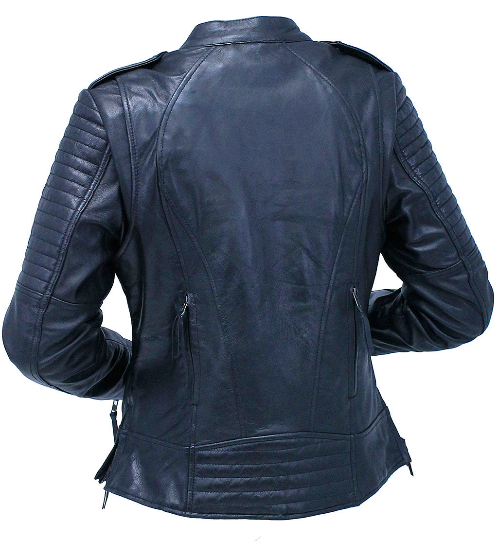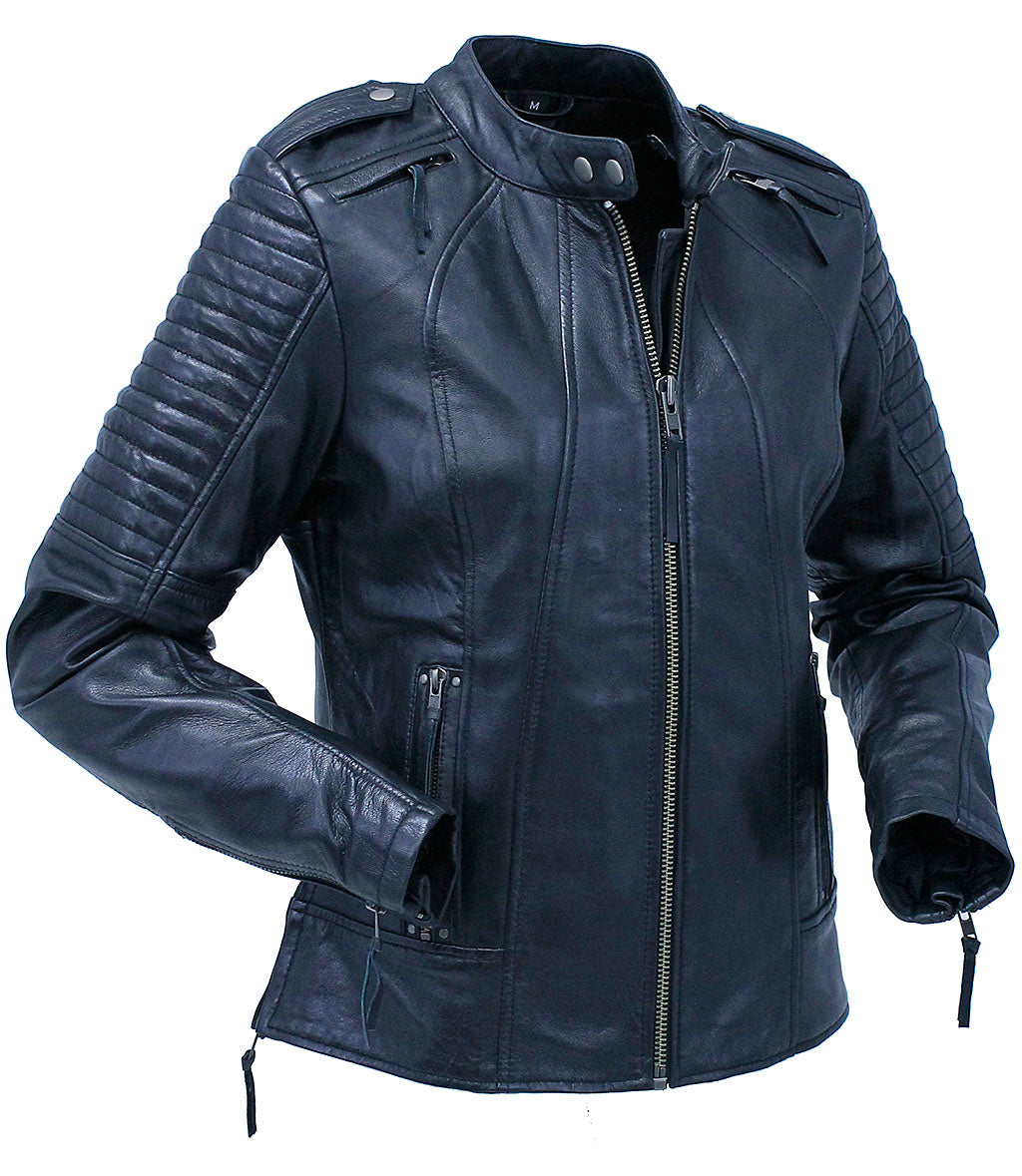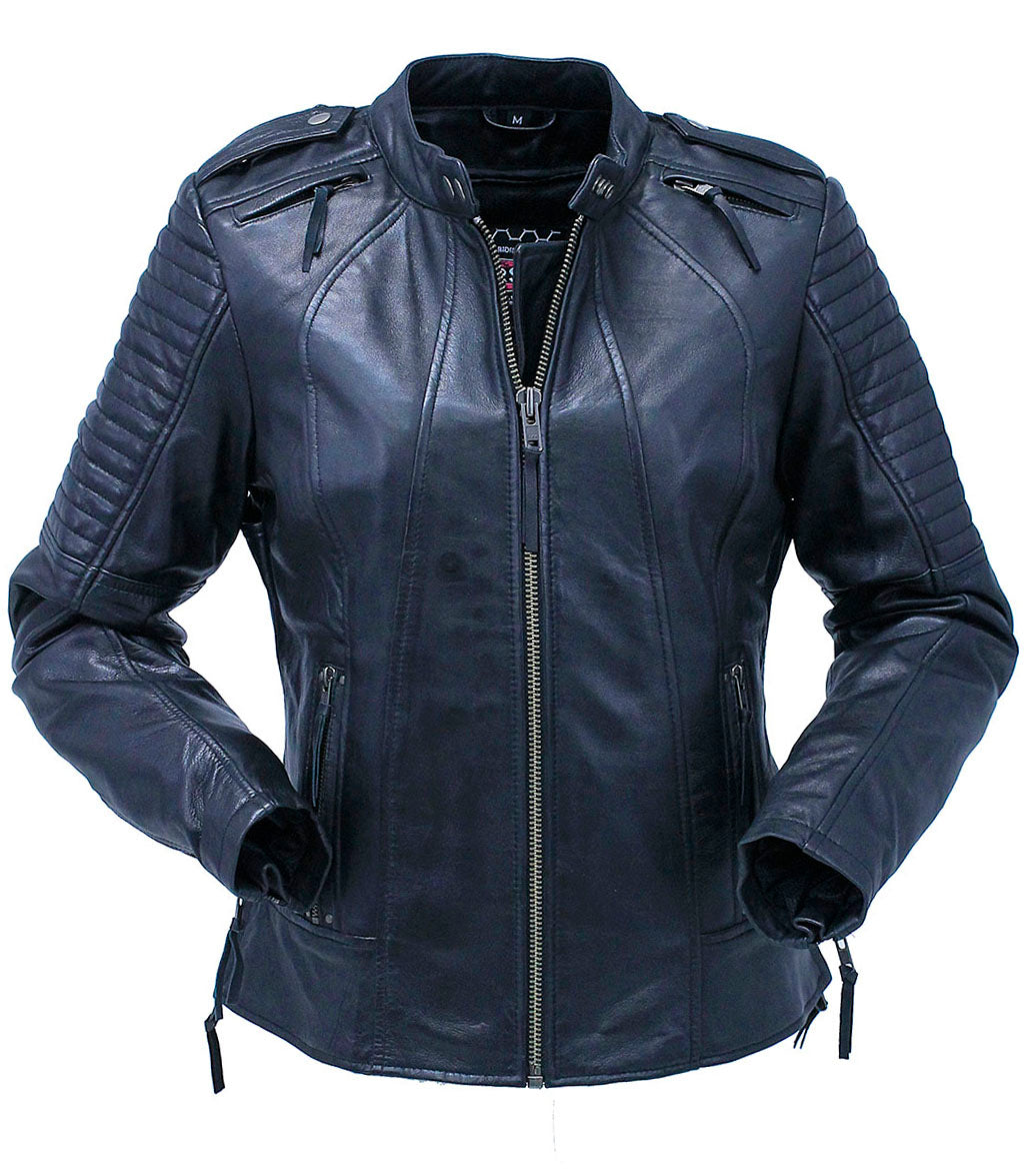 Show your rebel side with this women's leather motorcycle jacket in real soft lambskin leather. This moto jacket for women for those who don't like the bulk and weight of a heavy motorcycle jacket. This black leather café racer style women's jacket comes with a zip out full sleeve lining, zipper shoulder vents, two back zipper vents, hip side zippers for sitting comfort, dual inside concealed vertical pockets, two zip front pockets, zip cuffs to keep the wind out, and a mandarin collar with snap. Sizes: S, M, L, XL, 2X, 3X. +$10 for 2X-3X. [4#]