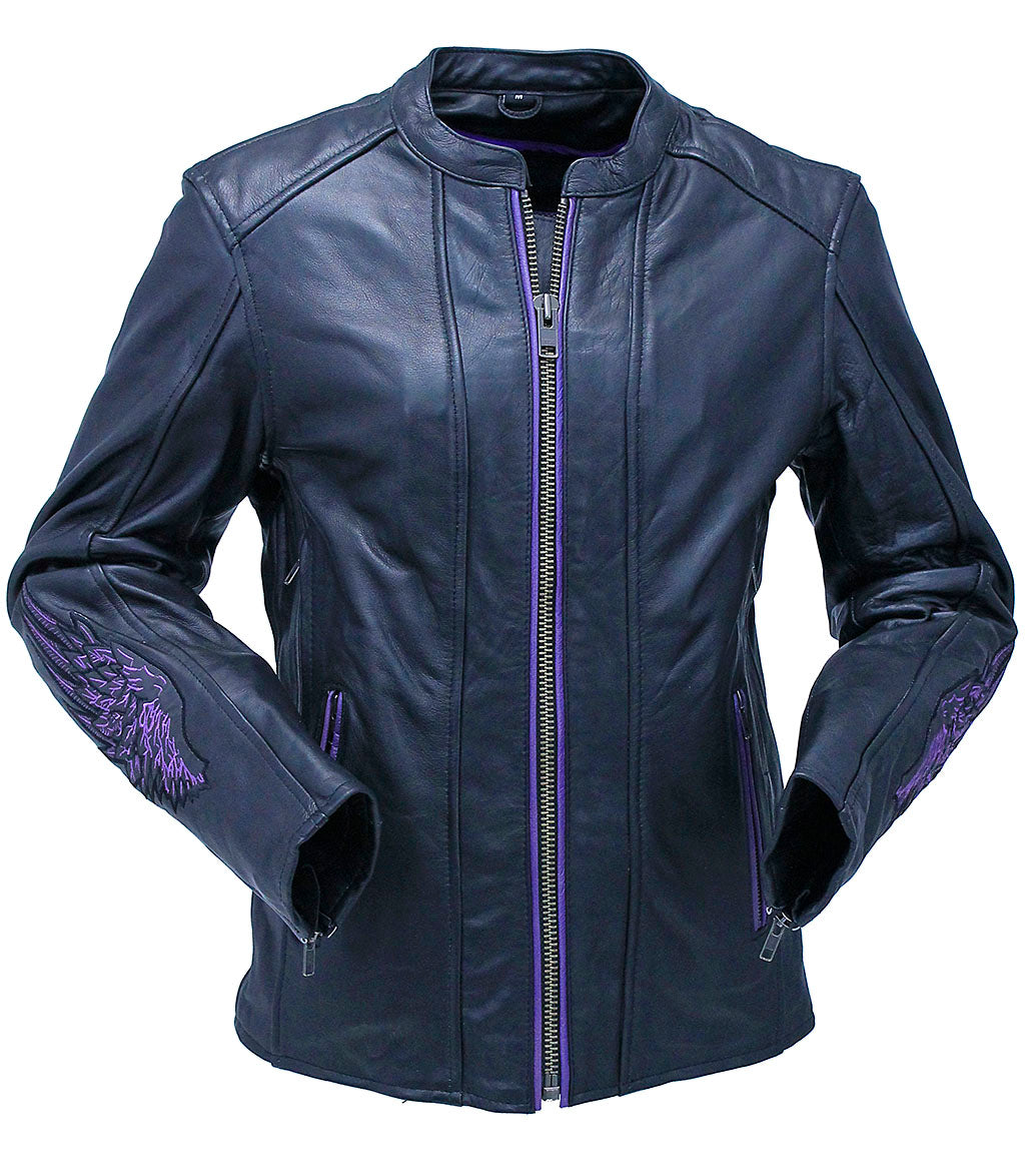 Women's purple and black leather jacket with embroidered heart wings on back in ultra soft cowhide leather. A ladies leather jacket with purple embroidered and reflector wings on each arm and on back along with purple leather trim. This vented women's leather jacket comes with front and back vertical back zipper vents, full sleeve zip out lining, matching nylon mesh lining inside, quality YKK zippers, zip cuffs to keep the wind out, zip front pockets to keep your stuff in, dual inside concealed pockets with barrel loops, butt zippers for sitting comfort, inside vertical chest pockets, snap down mandarin collar and made of a premium heavy naked cowhide leather. Sizes: XS, S, M, L, XL, 2X, 3X. +$10 for 2X-3X. [6#]
