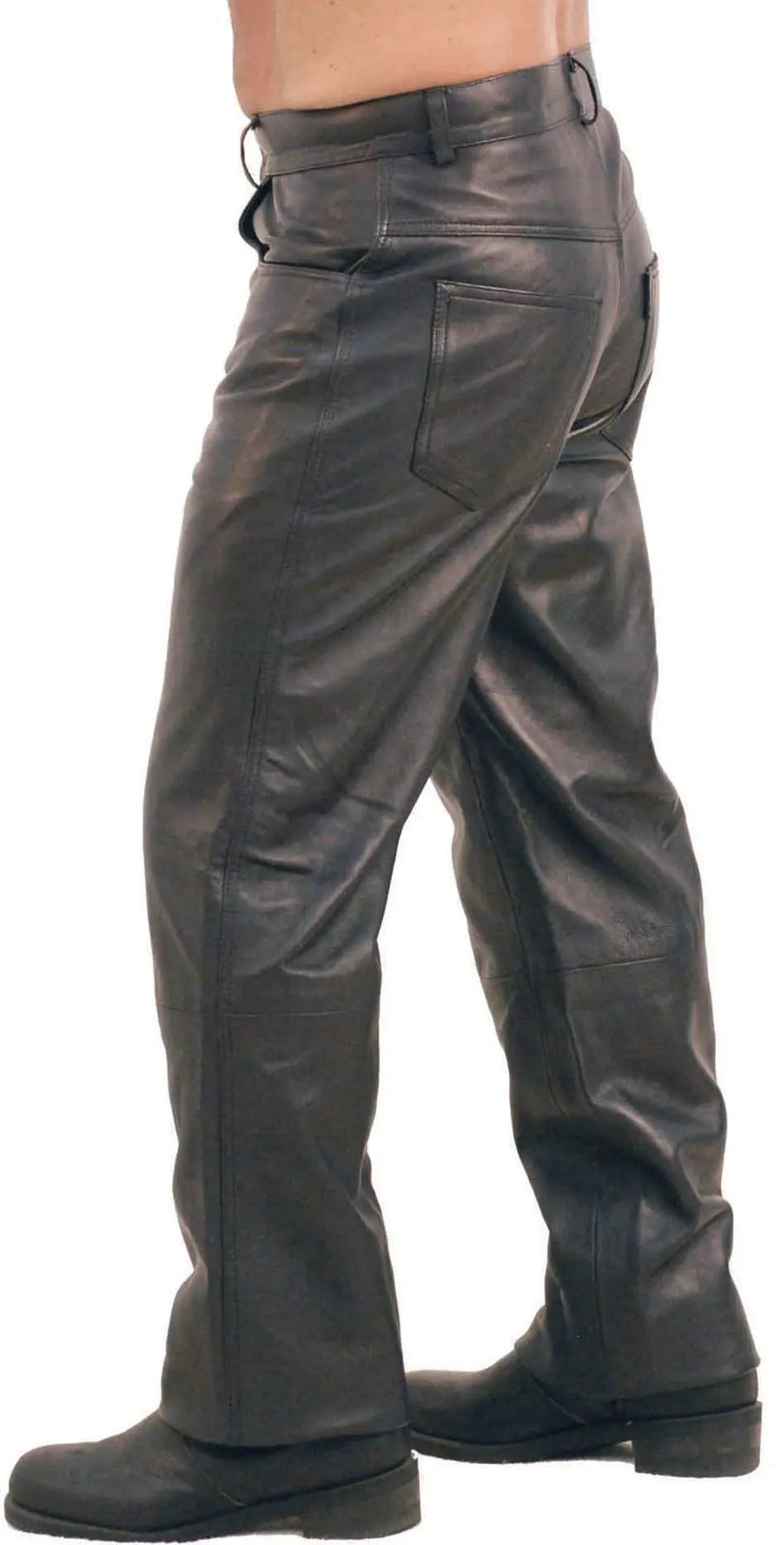Jamin Leather's® most popular men's' lambskin leather pants. These extra soft leather pants come in a 5 pocket jean style and made of premium soft lambskin leather. Ideal for dress wear. These quality leather jeans / trousers come with a soft nylon lining, 3 front pockets and two rear patch pockets. Pants can easily be hemmed with leather glue or cut with household sheers. Sizes: 28, 30, 32, 34, 36, 38, 40, 42, 44, 46, 48, 50. +$10 for 42-44, +$20 for 46-48, +$30 for 50. [3#]
