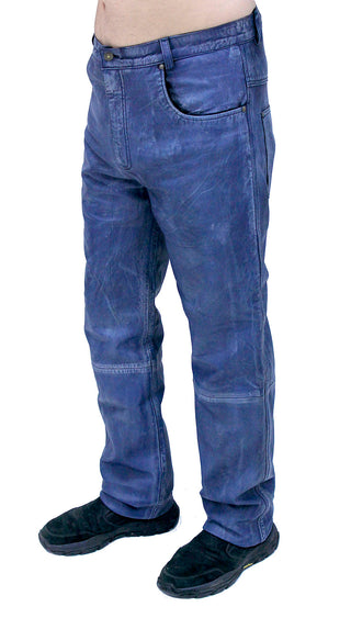 Men s blue leather pants with a hand rubbed antiqued finish and soft