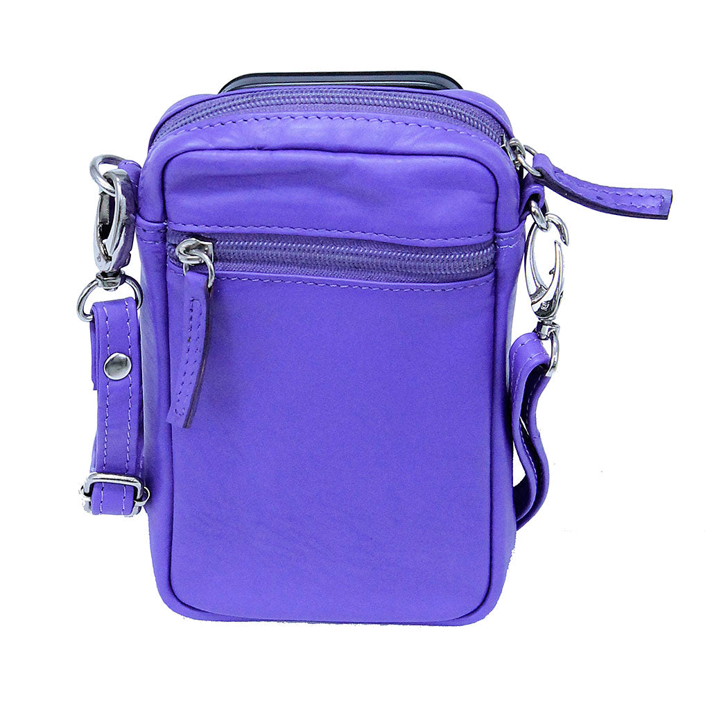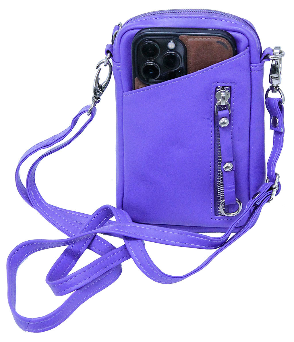 Purple leather cross body mobile phone purse or cell phone pouch for the larger phones of today.  This soft leather crossbody pouch comes with an extra long adjustable and removable shoulder strap. This cell phone purse is made of soft black lambskin leather with three zippered pockets along with an easy access front cell phone pocket. Ideal to organize all the necessities that won't look good stuck in your pockets. The front cell phone pocket will fit a variety of large size phones. The large zip top main compartment could also hide your phone inside. A long adjustable shoulder strap to keep it handy at your side. Measures overall 4" x 7" x 1". [2#]