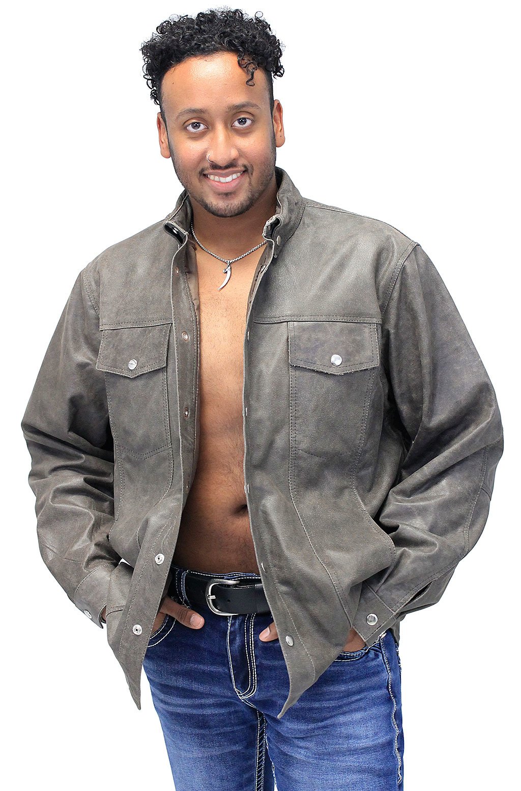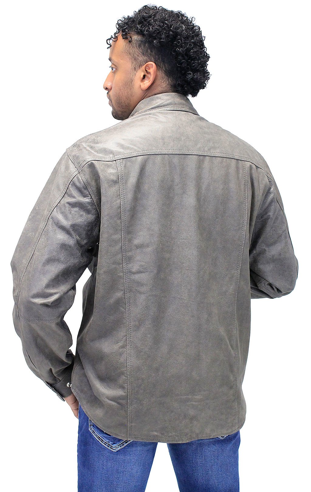 Brown leather shirt or lightweight jacket alternative to a heavy jacket. Brown tones can vary. This men's leather shirt is made of premium soft medium brown distressed buffalo leather. A snap up shirt that is ideal for warmer weather. Classic styling and comes with snap down chest pockets, snap cuffs, inside chest pocket, two hidden front pockets and a soft nylon lining. A Jamin Leather® Exclusive Quality Brand. Sizes: S, M, L, XL, 2X, 3X. +$10 for 2X-3X. [6#]