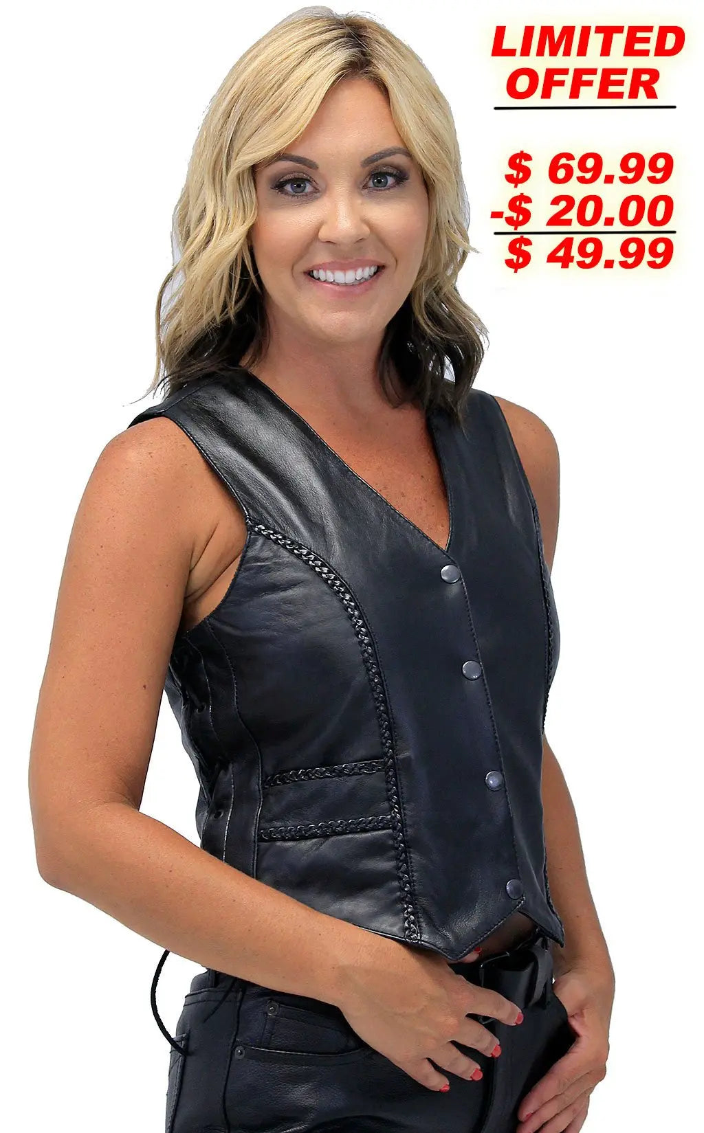 Women's lightweight vest in ultra soft lambskin. This black leather vest for women has a braid trim and side lacing. A quality black leather vest with two front pockets and a soft nylon lining for the ladies looking for an upscale classic leather look. A quality ladies black vest with adjustable side lacing that can be let out, if needed for that perfect form fitted look. Sizes may run small. Sizes: S, M, L, XL, 2X, 3X, 4X, 5X. +$6 for 2X-3X, +$12 for 4X-5X. [3#]