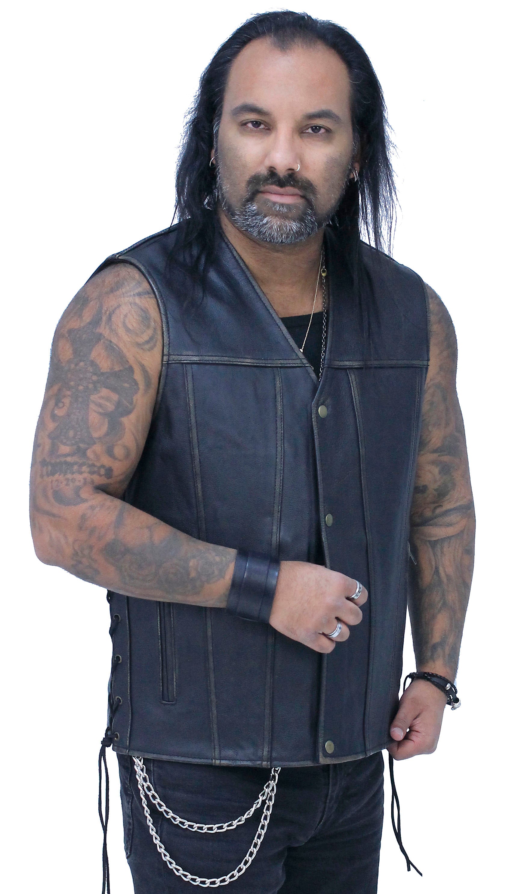 Concealed carry vintage brown side lace vest for men in premium buffalo leather, antiqued to perfection. A brown buffalo leather Concealed Pocket vest with barrel loops inside the concealment pockets, adjustable side lacing and single panel back which is ideal for your club patches. This straight bottom men's leather vest is made of premium buffalo leather. Other features include zip front pockets, L24 snap up front and soft nylon lining. Heavy leather rawhide side lacing is adjustable enough to wear on the outside of your jacket when you are wearing patches. Sizes: M, L, 2X, 3X. +$6 for 2X-3X. [4#]
