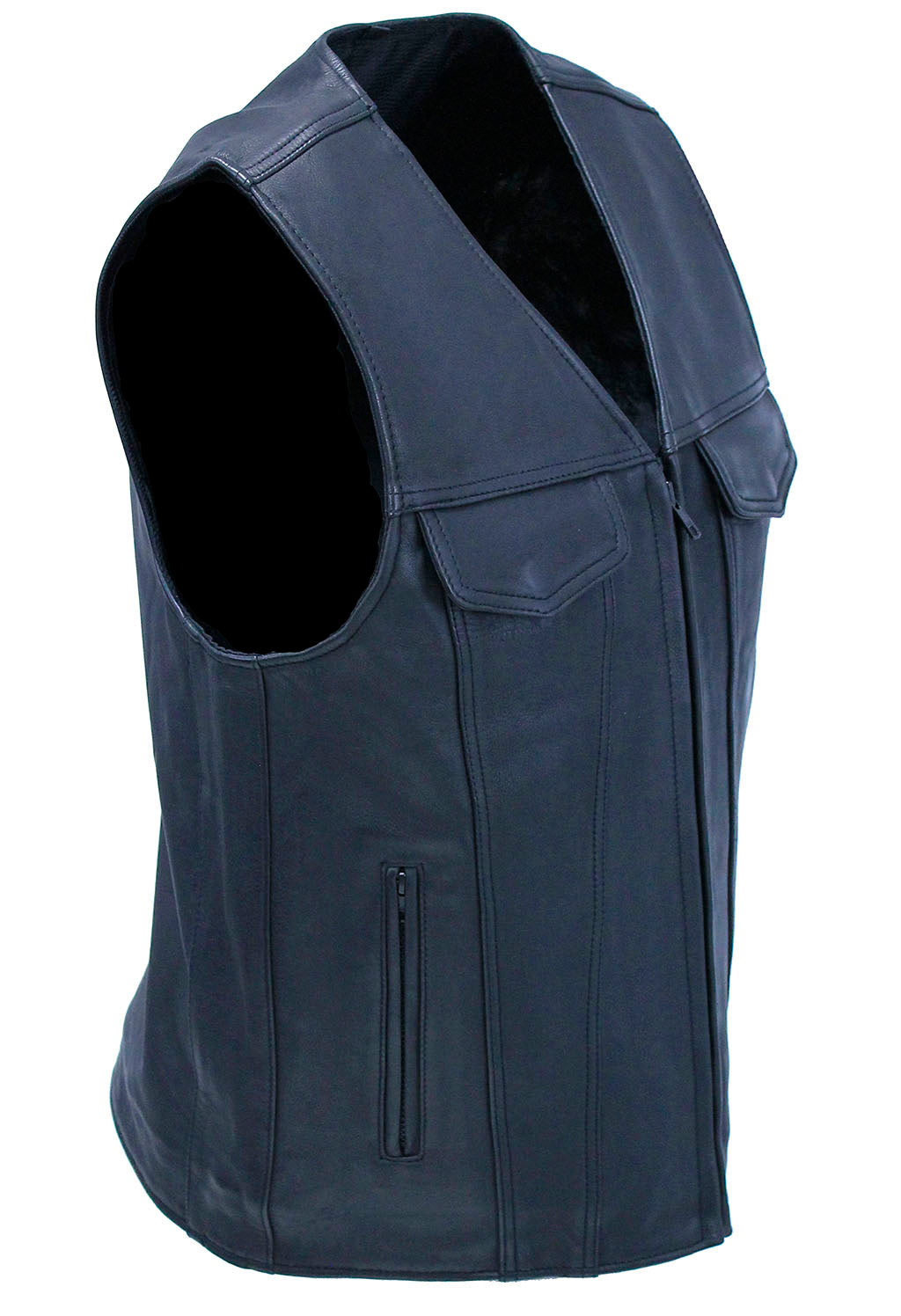 Men's black leather vest in super comfortable ultra premium cowhide leather with concealed inside pockets. A V-neck zip front black leather vest for men with heavy duty zip front, two front zipper pockets, two chest snap down pockets, soft nylon mesh lining, one piece back, and a soft nylon lining. Sizes: M, L, XL, 2X, 3X, 4X. +$6 for 2X-3X, +$12 for 4X-5X. [4#]