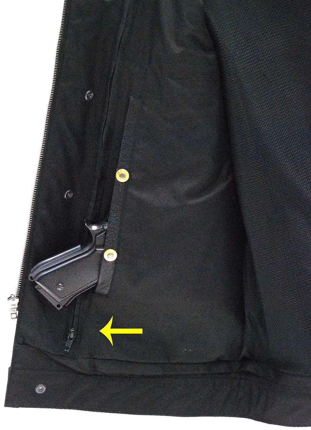 easy access left side (right handed) concealed pocket that is outside the front zipper