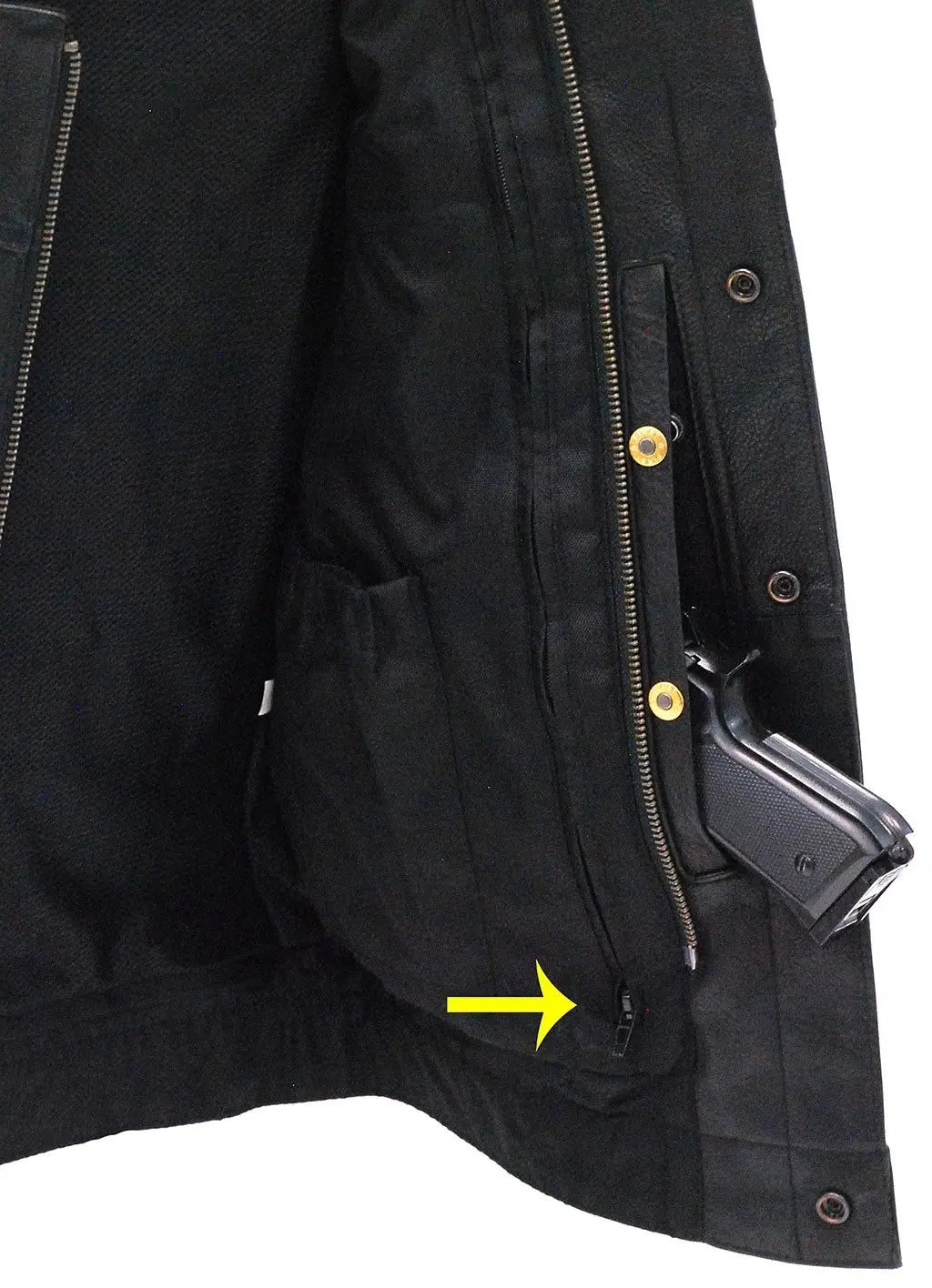 NOW UP TO 8X available. Concealed carry vest with easy access concealed carry pocket and one piece back. This concealed carry leather vest includes liner zippers for club patch installation and bullet snap heads on the dual inside pockets. A concealed carry men's vest with zipper and snap flap with hidden pocket in between. This concealed carry men's vest is made of premium heavy 1.3-4 mm thick Ultra Premium cowhide leather with snap down front chest pockets, eyeglass hole in left chest pocket, lower snap front pockets, full front YKK zipper, over-sized vertical entry pockets with barrel loops inside to keep that piece in place (also used as an oversized hidden pocket, one inside cell phone pocket and a heavy nylon and denim lining. Its large solid leather back and large arm holes is ideal for your clubs and their patches and to wear over a leather jacket. Sizes: M, L, XL, 2X, 3X, 4X, 5X. +$10 for 2X-3X, +$20 for 4X-5X. [6#]