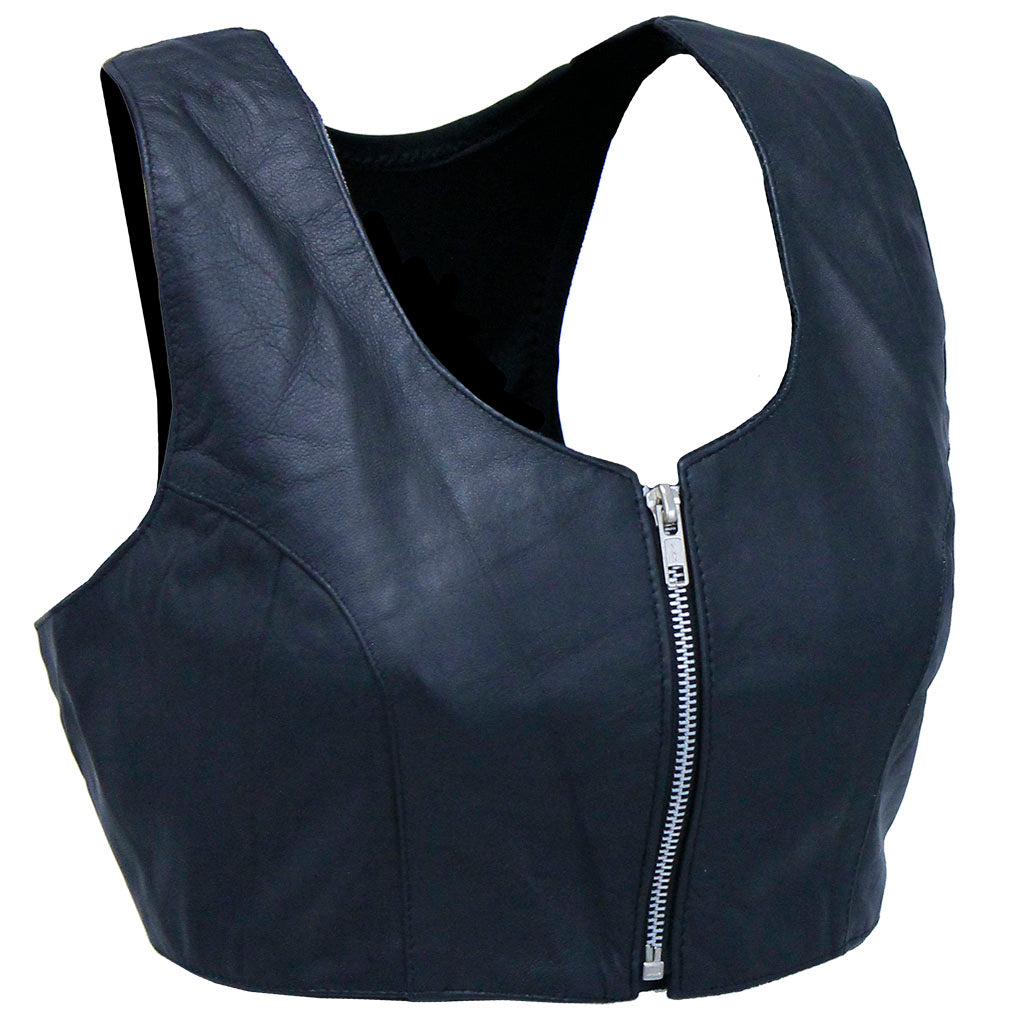 Black leather top zipper with Lycra stretch sport back for best fit. Bargain priced zippered leather top is made of premium, extra soft lambskin leather. A women's black lambskin leather top is a must for your next special event. A simple leather zip top for any occasion. Sizes: XS, S, M, L, XL, 2X. +$6 for 2X. [2#]