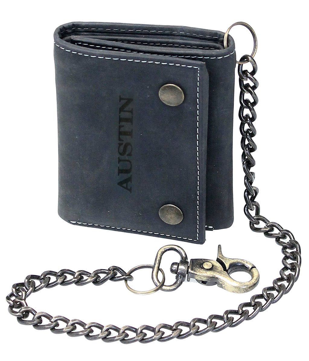 PERSONALIZATION OPTION: Vintage charcoal gray / black leather trifold RFID chain wallet with 11 pockets inside. The latest in ID protection is our RFID wallets that prevent a thief from rubbing against your wallet and taking critical data without your knowledge. A men's gray leather RFID wallet you will need one day. An updated chain wallet with RFID for men and a removable 12" long antique chain has a claw clip on one end to attach to your belt loop. So you won't need a belt to carry your chain wallet around. Inside is 5 card slots, one has an ID window, a zippered pocket for change, key or valuable items, 2 large bill compartments and two snaps that hold the wallet together. [2#]