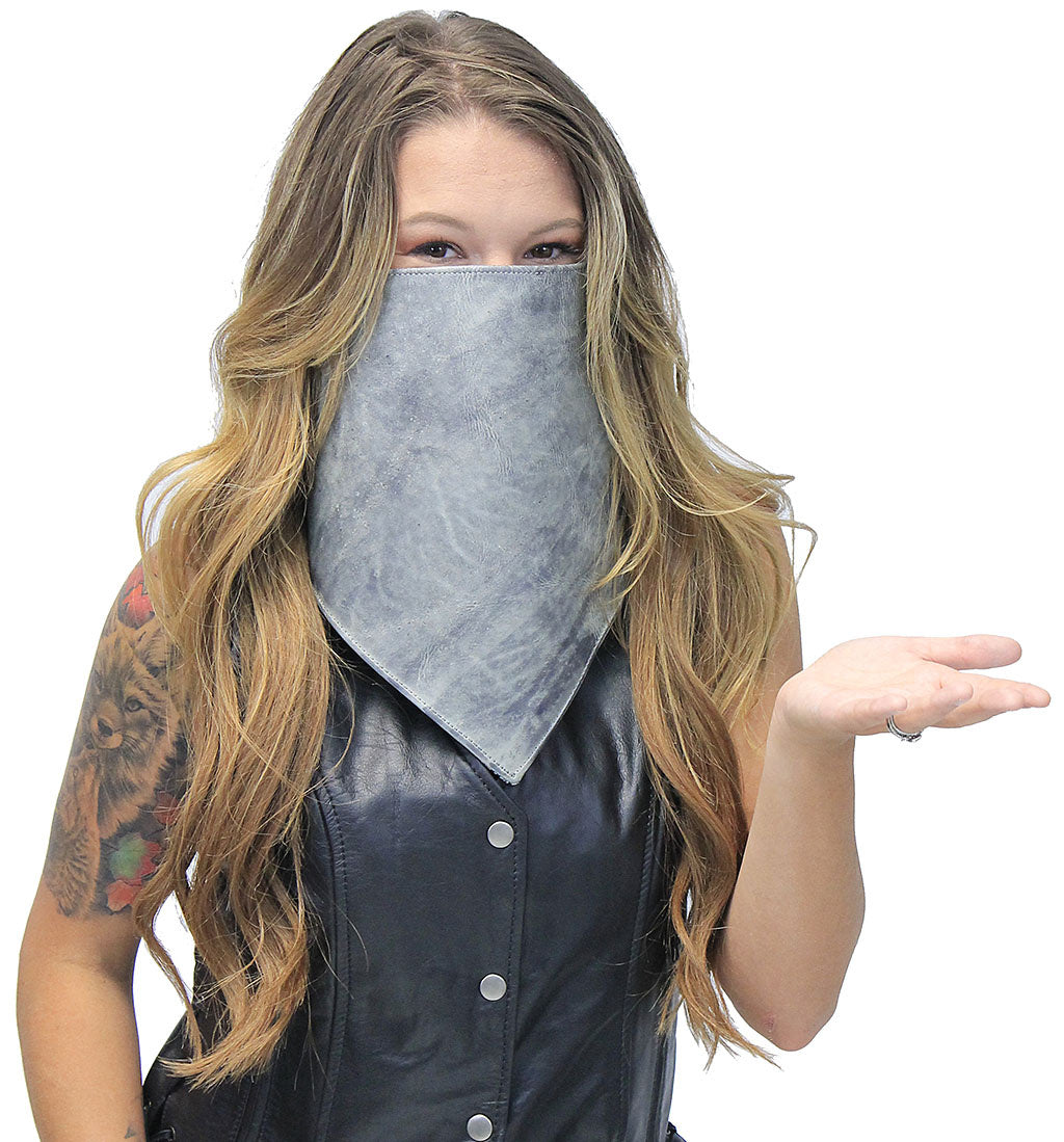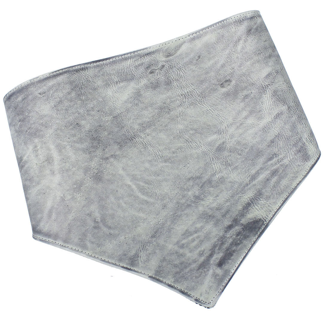 Firm, no slouch hand rubbed gray leather motorcycle scarf that is
