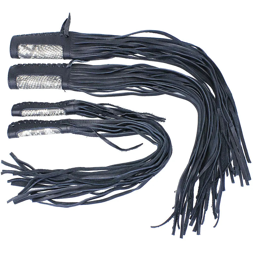 Snake leather printed inlays on this pair of throttle and handlebar fringe grip covers made of 7-8 oz. cowhide leather. These fringe leather motorcycle grips has 20" long heavy leather fringe that is heavy enough to not whip you while riding at most speeds. These snake inlay handle bar grip covers are a nice touch to accessorize your bike and will improves your grip. A great looking accessory for your bike. Add the matching clutch and brake lever covers for a complete set. [1#]