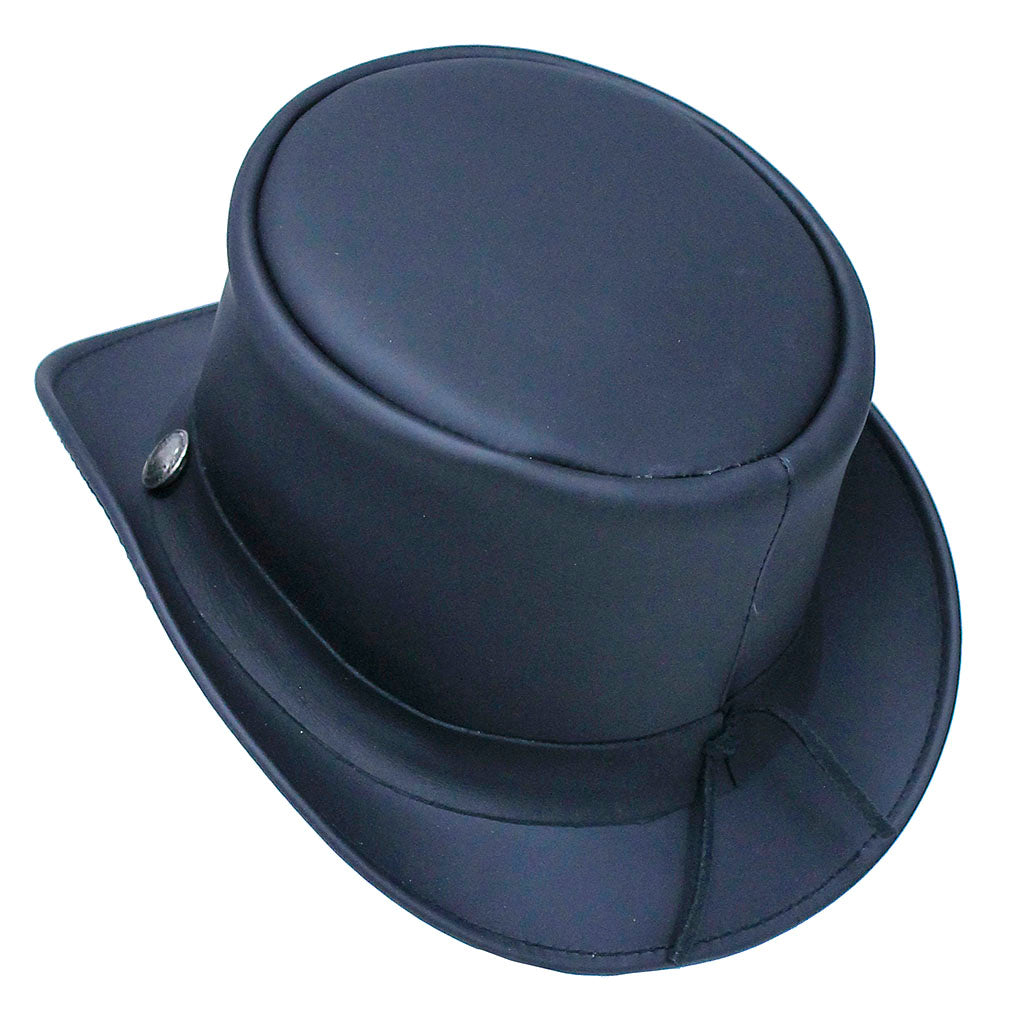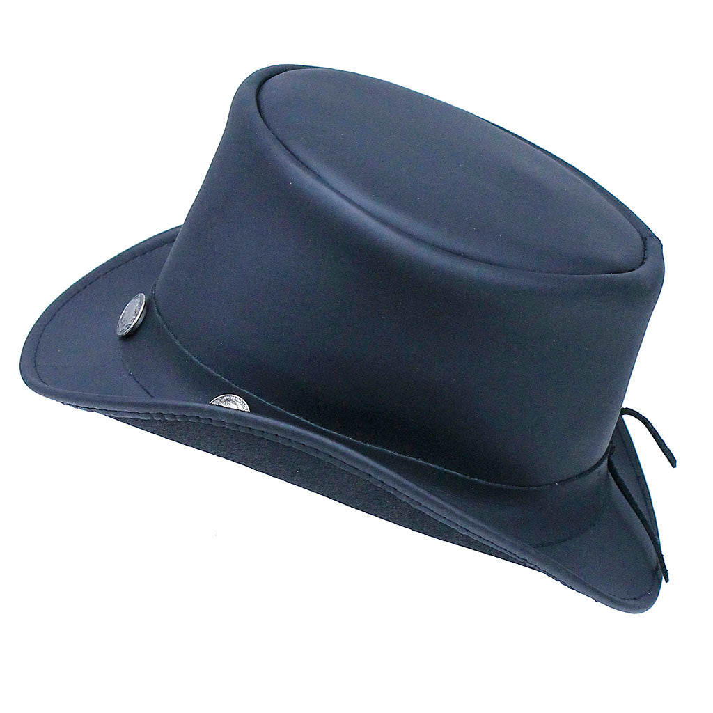 Biker tophat that is a modern day biker look. This black leather 5 inch tophat with buffalo nickels hatband. Heavy leather, imported economy top hat with a tall crown, 3/4" hat band with 3 buffalo nickels up front, leather tie tassel in back keeping the hat band on. This classic style tophat is made of 4-5 oz. top grain cowhide leather. Sizes: M, L XL, 2X. [5#]