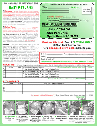 30 day refund, 60 day exchange. Discounted return labels available by request and FREE with our Best Fit Guarantee™ Click for a Return Label