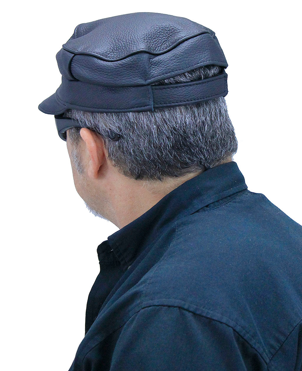 Leather cap for men and women in soft top grain cowhide leather. Soft enough to just roll it up, put it in your pocket or tool bag and go! Classic biker cap similar to the styling that Marlin Brando brought to the big screen. Made of durable black cowhide leather with leather backed soft bill on front and a soft nylon padded inside hat band for added comfort. One size fits all with its adjustable back strap. [#1]