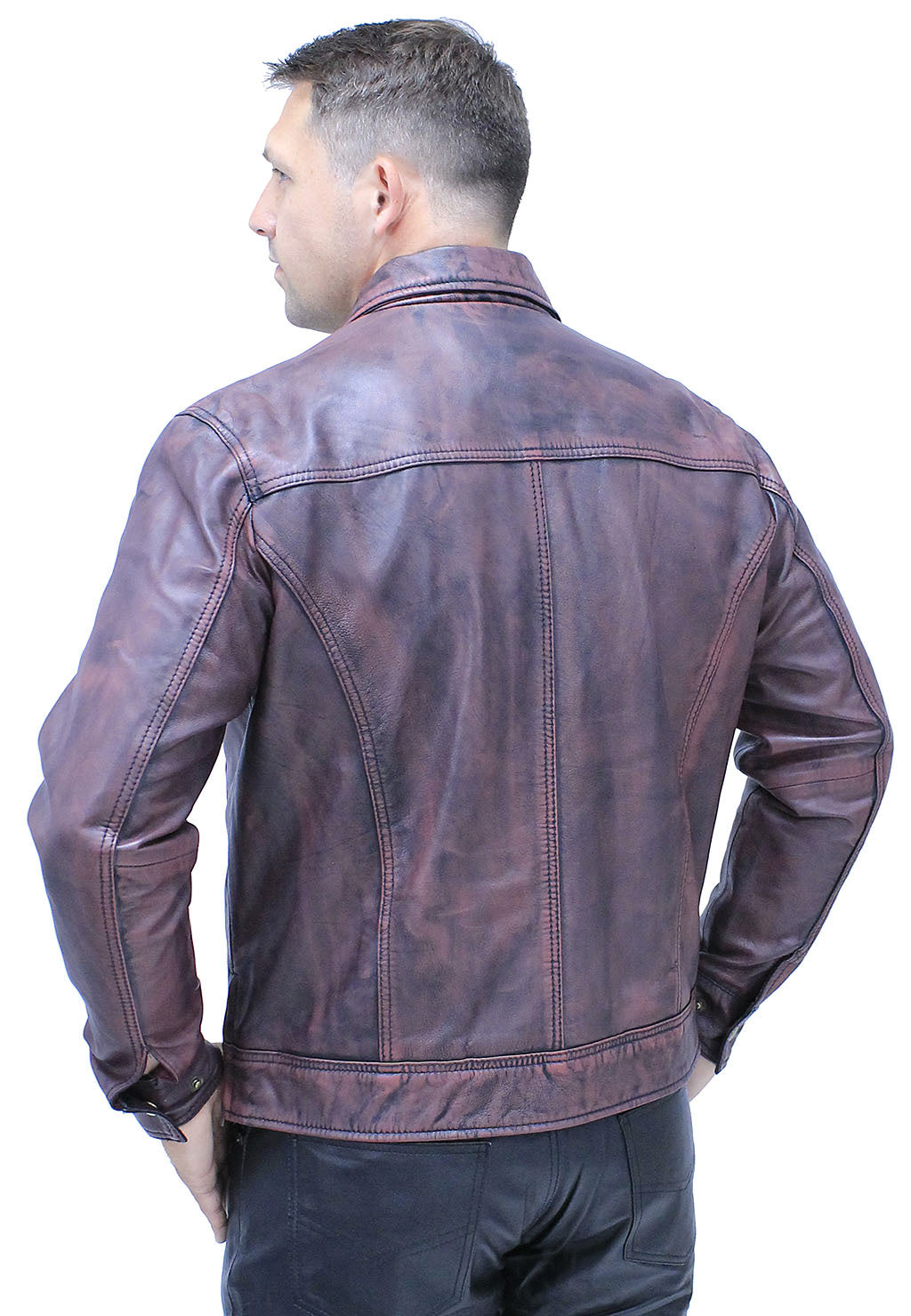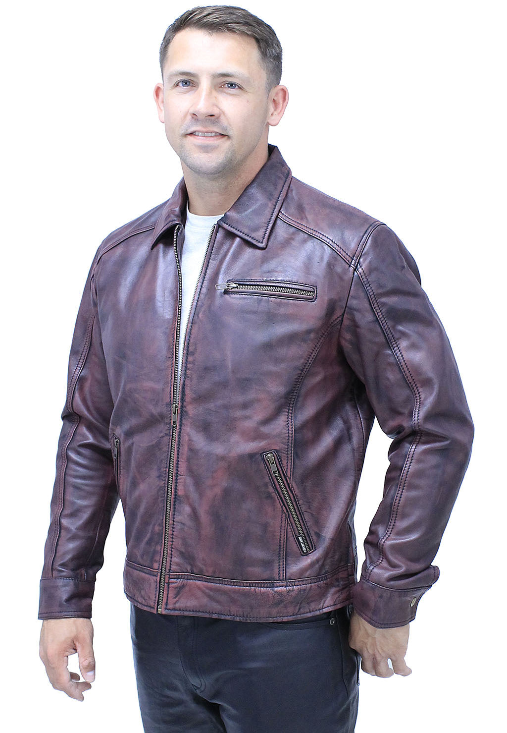 Exclusive Jamin Leather® Original men's timeless throwback burgundy leather jacket made of a super soft lambskin leather. This leather jacket is hand rubbed for a unique vintage well loved look. Comes with three front zippered pockets, three inside pockets (one is a CC vertical pocket with barrel loop inside), a shirt style collar, super soft and comfortable satin lining, antiqued brass hardware, zippered cuffs, and side zippers for sitting comfort. A simple classic yet timeless style jacket for everyday use. Sizes: M, L, XL, 2X, 3X, 4X. +$10 for 2X-3X, +$20 for 4X. [6#]