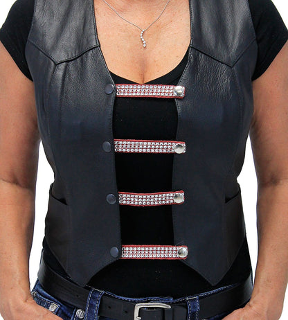 Long red crystal vest extenders sold as a complete set of 4. These simulated crystal on red leather women's vest extenders are 4" long and can add two or more sizes to any vest. Ideal for when you grow out of that old vest that you love so much but wish to continue wearing it. A Jamin Leather® Exclusive! These shimmering simulated crystal red leather vest extenders with bling are made with cowhide leather straps. Fits Standard L24 snaps. [1#]