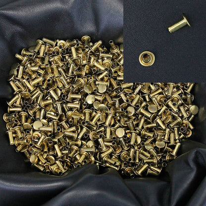 1000 pcs 10mm (approx. 3/8"x5/16") non-rusting solid brass semi-tubular metal rivet posts. Ideal for your leather project and other materials. Solid brass lightly tarnished finish that will never rust. Special blowout price while supplies last.