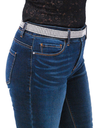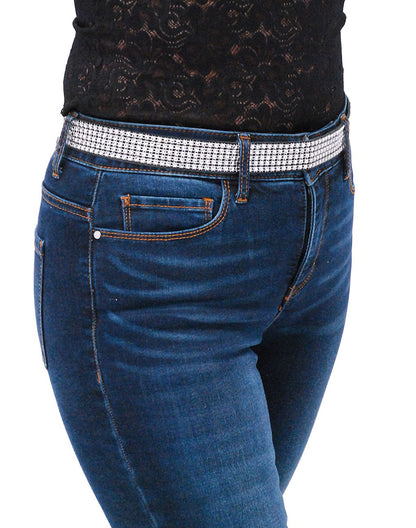 mWomen's Leather belt with bling for those who want something a bit more flashy. A soft and comfortable cowhide leather belt with no buckle and hundreds of simulated crystals all around. This crystal belt adjusts with snaps on the back and can be trimmed to shorten if needed. A genuine leather belt that is 1" wide to wear over a dress or inside your pants belt loops. Recommend measuring your favorite belt before ordering. Jamin Leather® exclusive original. Made in USA. Sizes: S (28-32), M (32-36), L (36-40), XL (40-44), 2X (44-48), 3X (48-52). +$5 for 2X-3X. [1#]