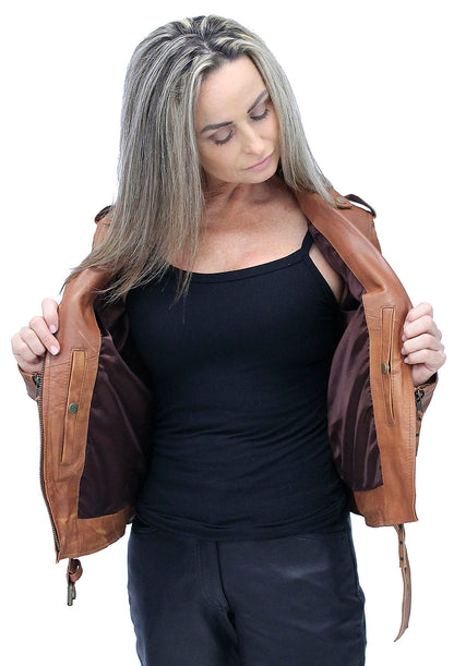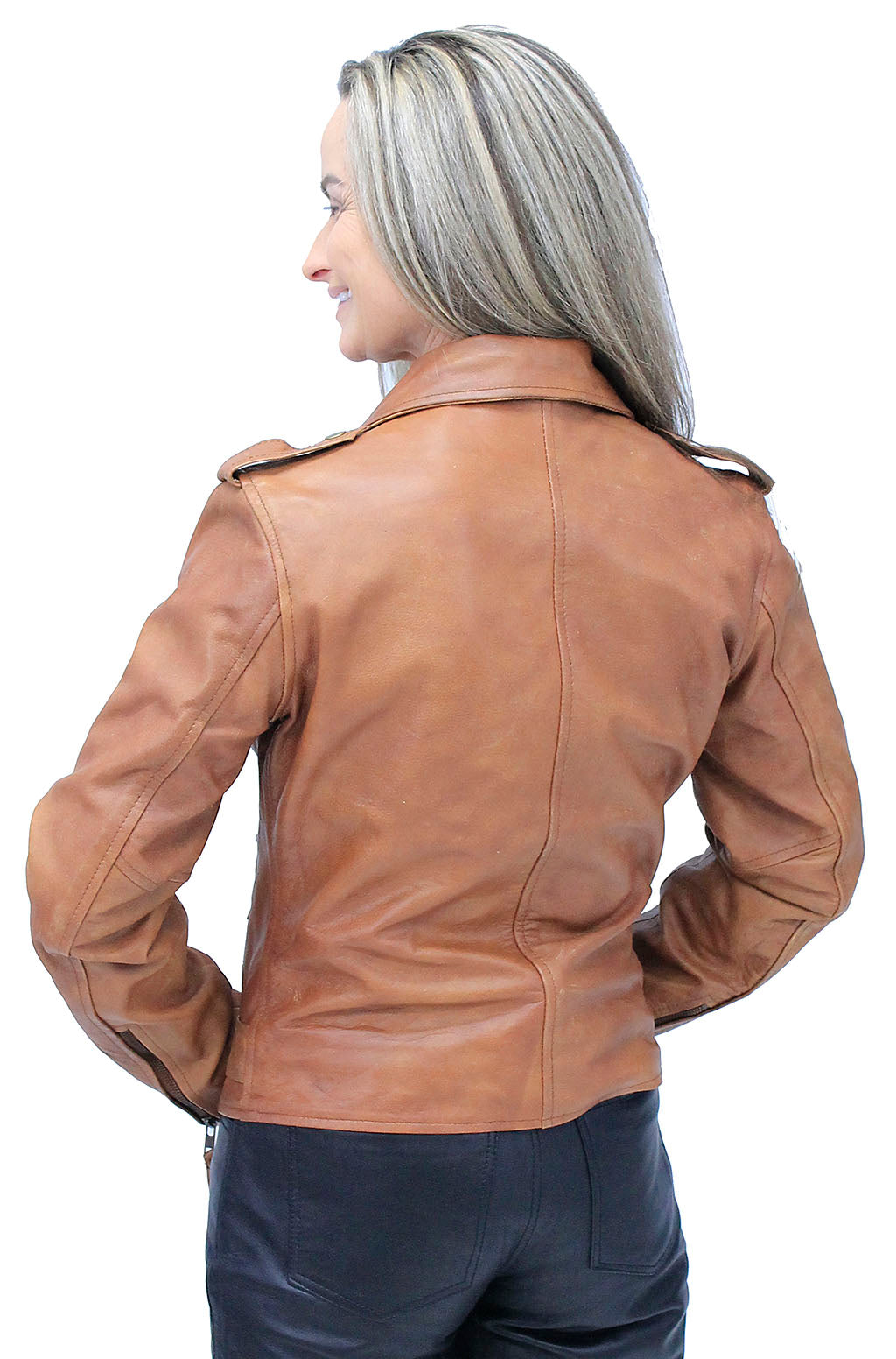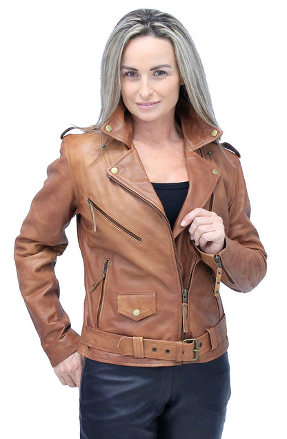 Ultimate motorcycle jacket for women in brown leather with a unique antique finish. This Arizona brown leather motorcycle jacket is made of super soft lambskin with adjustable front belt and two vertical entry inside chest pockets. A classic style jacket that is ideal for everyday use. Also comes with snap down motorcycle collar, asymmetric front zipper, three zippered front pockets, small snap down lighter pocket, zipped cuffs, soft nylon lining and made of premium grade lambskin leather. Due to the dying process the brown tones can vary. Sizes: S, M, L, XL, 2X, 3X. +$10 for 2X-3X. [5#]