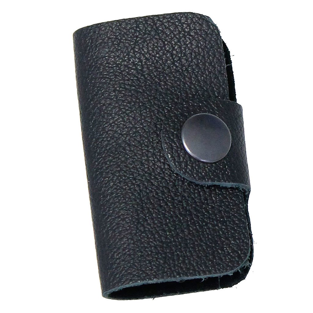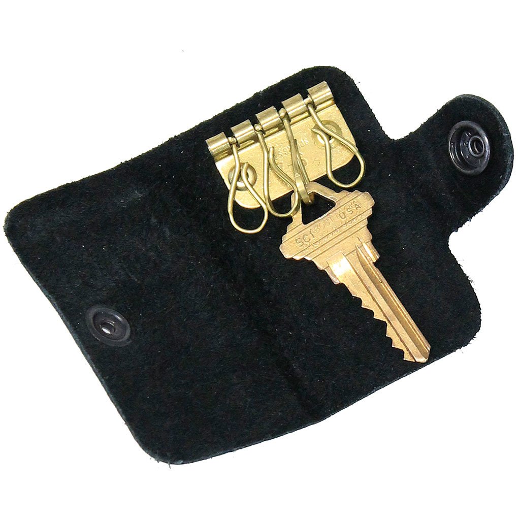 Small 4 key hook black leather key case with snap. Made of premium cowhide leather with heavy duty snap and brass plated durable key hooks inside. Made in USA.
