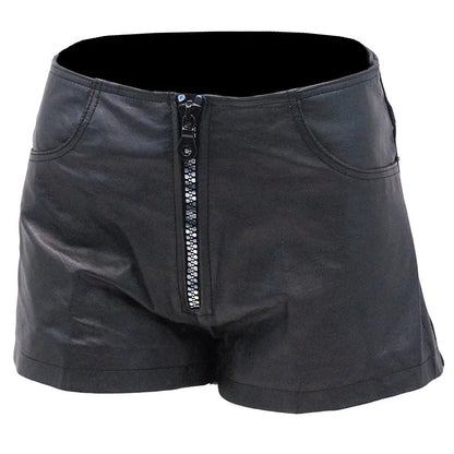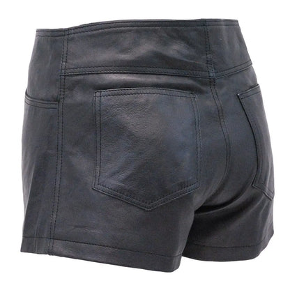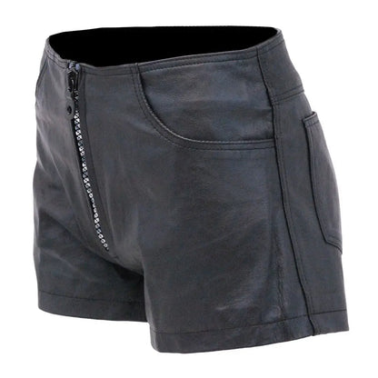 Black leather booty shorts at a blow out bargain sale price. These cowhide leather shorts come with a shimmering silver and black front zipper. Short shorts with pockets that fits best for women with more narrow hips. A cute looking pair of ladies leather booty shorts with two front pockets, two rear patch pockets and are made of premium quality cowhide leather. Not only are these great looking but they are at a price so cheap you can't pass them up. We recommend measuring before purchasing. Sizes (+/-1" on measurements above): S, M, L, XL, 2X, 3X. +$6 for 2X-3X. [2#]