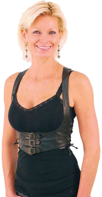Bustiers with a triple buckle front. A Leather bustier may add a little lift to your center of gravity! This form enhancing leather bustier top can be worn with any of your favorite spandex, lace or other tops to impress or make others jealous. A women's leather top that comes with lace up back and sides that can be adjusted for perfect fit. Comes nylon lined, and made of premium buffalo leather firm enough to keep things in place. A Jamin Leather® excusive leather top. Measure chest under the breast for best fit. A Jamin Leather® quality brand exclusive leather bustier. Sizes: S (33), M (36), L (39), XL (42). [2#]