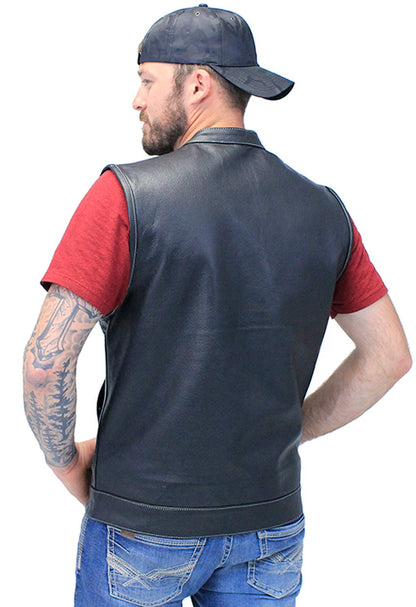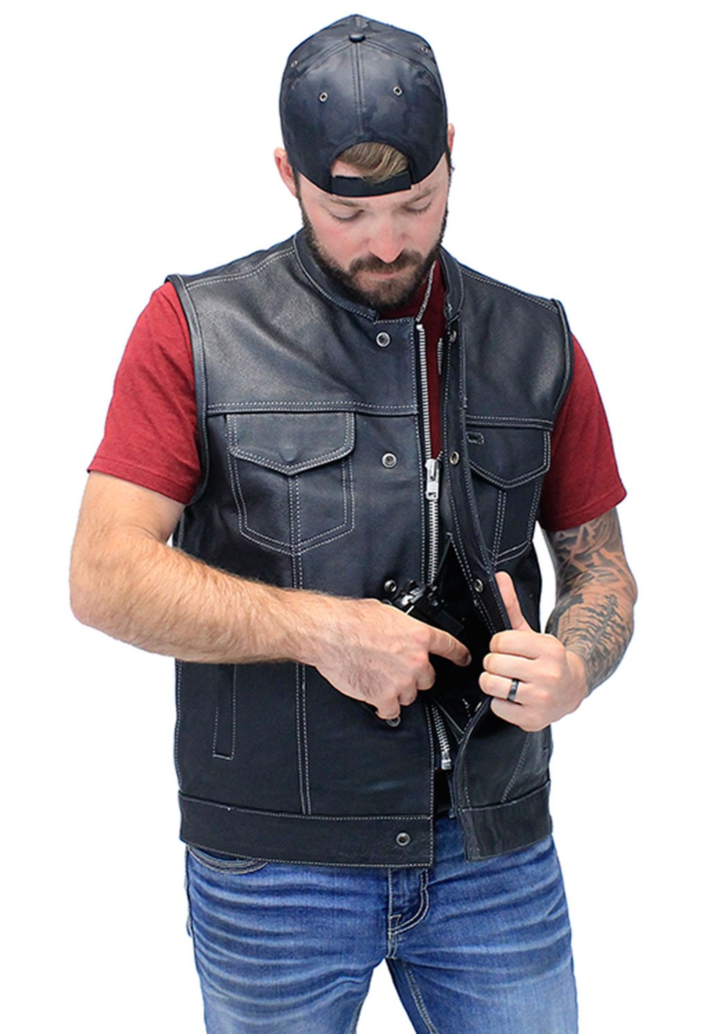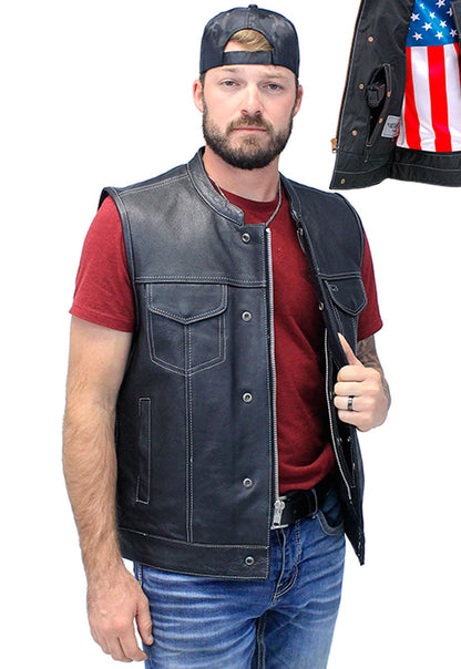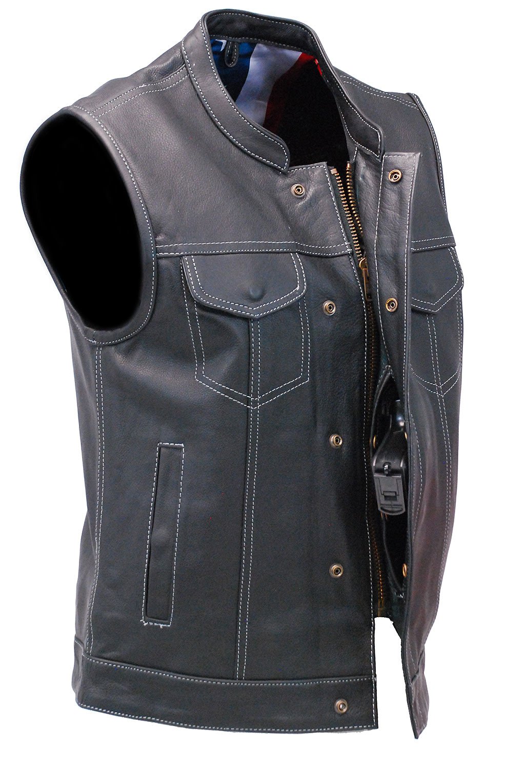 Black leather MC vest with flag inside lining has a hidden zipper in the lining for easy access patch installation, easy access concealed pocket, mandarin collar and two inside concealed carry pockets. The right side concealed carry pocket is tucked in between the snap and zipper so you won't have to take the leather cut vest off to grab your protective device. This men's flag lined vest is a premium leather cut vest that also comes with a one piece back ideal for patches, two snap down chest pockets, two lower side entry front snap pockets, hidden front zipper and snaps, and a soft nylon and mesh lining. This premium leather club vest is accented nicely with gray stitching all around and made of premium soft touch 1.2-3 mm thick cowhide leather. Sizes M, L, XL, 2X, 3X, 4X, 5X. +$10 for 2X-3X, +$20 for 4X-5X. [4#]