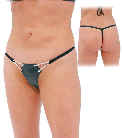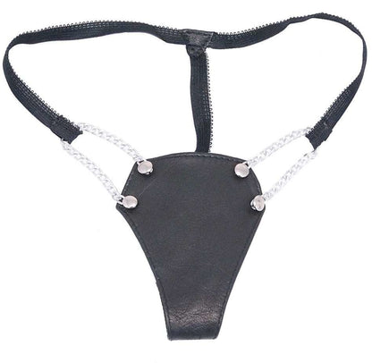 Leather G-string with chains in black leather for that special occasion or performance. A great addition to your leather panties drawer! These leather G-string are made with soft lambskin leather and have chrome rivets attached to the aluminum lightweight chain. A simple elastic side and back strap allow for these to be one size fits most comfortably up to size 12. Made in the USA and a Jamin Leather® Exclusive! *Lingerie is not returnable*. Universal fitting one size fits most. [.5#]