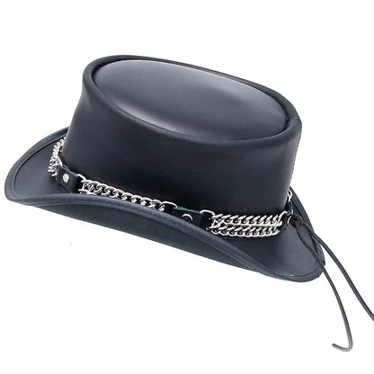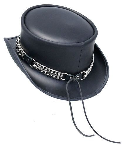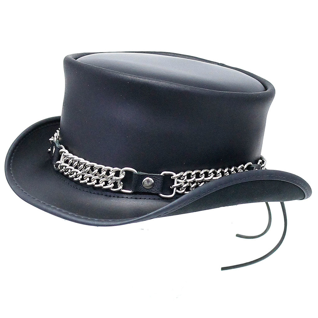 A chain hatband made with black leather separators (hat sold separately). This leather hatband with chains is handmade. Double row nickel plated curb chain hatband that matches your vest extenders or Jamin Leather® chain belts available. Simply ties on black with rawhide lacing and can be hot-glued in place to your favorite cowboy or tophat. Made in USA. One size fits all. [1#]