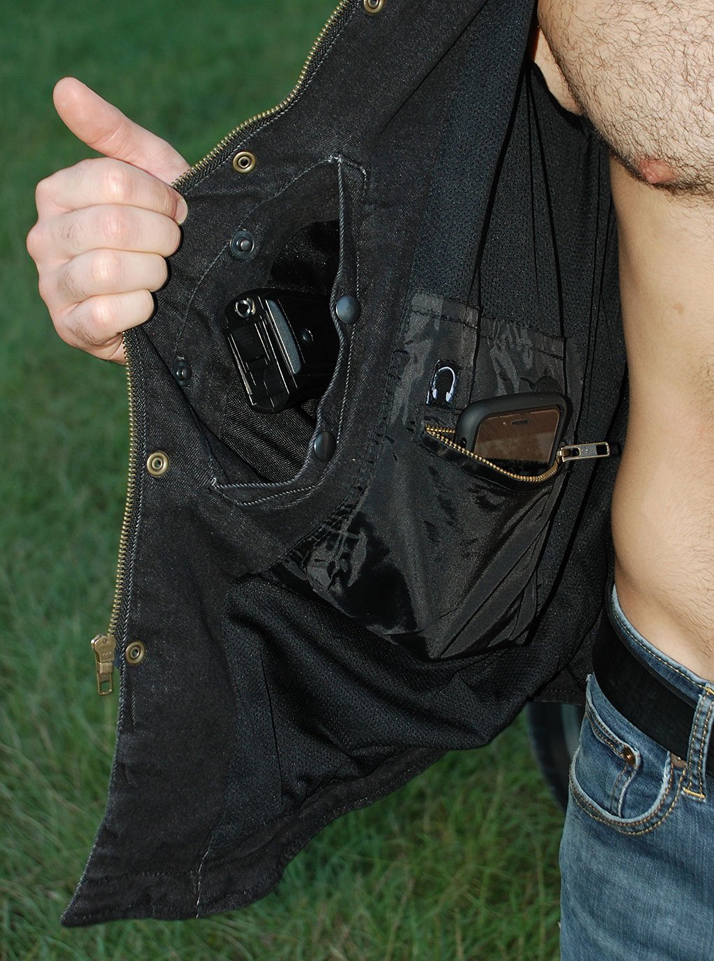 Heavy yet soft flannel motorcycle shirt with removable armor pads which include back, shoulder and elbow pads. This men's biker shirt comes with dual concealed carry pockets to keep your piece handy. A concealed carry shirt with hidden front zipper behind the front snaps. A classic shirt style that comes with two front pockets, two front chest pockets, snap down collar, zip and snap cuffs, inside cell phone pocket, and a hole for your head phone wire. The CCW pockets have barrel loops on the inside to keep that firearm in place. Sizes: M, L, XL, 2X, 3X, 4X, 5X. +$6 for 2X-3X, +$12 for 4X-5X. [3#]