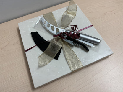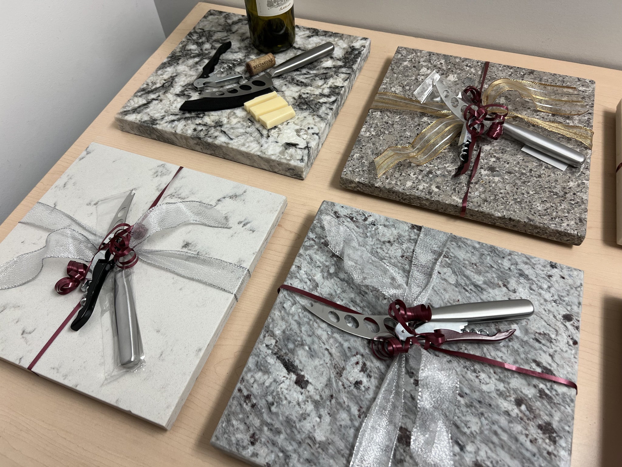 Genuine stone cheese boards made of a variety of granite, quartz and marble colors. This genuine stone charcuterie board comes with a sharp cheese knife with hand made leather sheath and wine bottle opener. Also ideal as a centerpiece pedestal. Sizes measure either 10" or 12" square with 4 heavy duty rubber feet to not scratch your counter tops. Thickness is between 3/4" and 1.25" thick and weighs between 10 and 18 lbs. Colors cannot be specific to photo since they are natural stone and colors within the stone will vary but will closely match the ordered color. The leather sheath comes in a variety of soft grains and textures. [18#]