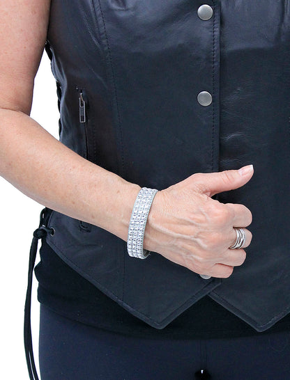 Handmade soft genuine leather wristband with simulated crystal and adjustable snaps. This leather and crystal bracelet is made of soft top grain gray cowhide/buffalo leather and adjustable heavy duty nickel plated chrome snaps at each end for a comfortable fit.  Made in USA, actually Made in South Carolina exclusively by Jamin Leather®. [1#]