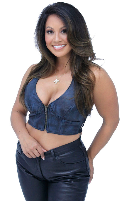 A blue Leather halter top that is cute and form fitting. Made with a vintage rub blue and black antiqued soft lambskin leather. This crop style halter top comes with wide stretch elastic back for best form flattering fit. A blue halter top that features a 5" front zipper and adjustable snap neck strap. A Jamin Leather® Exclusive. Sizes: XS, S, M, L, XL, 2X, 3X. +$6 for 2X-3X. [1#]