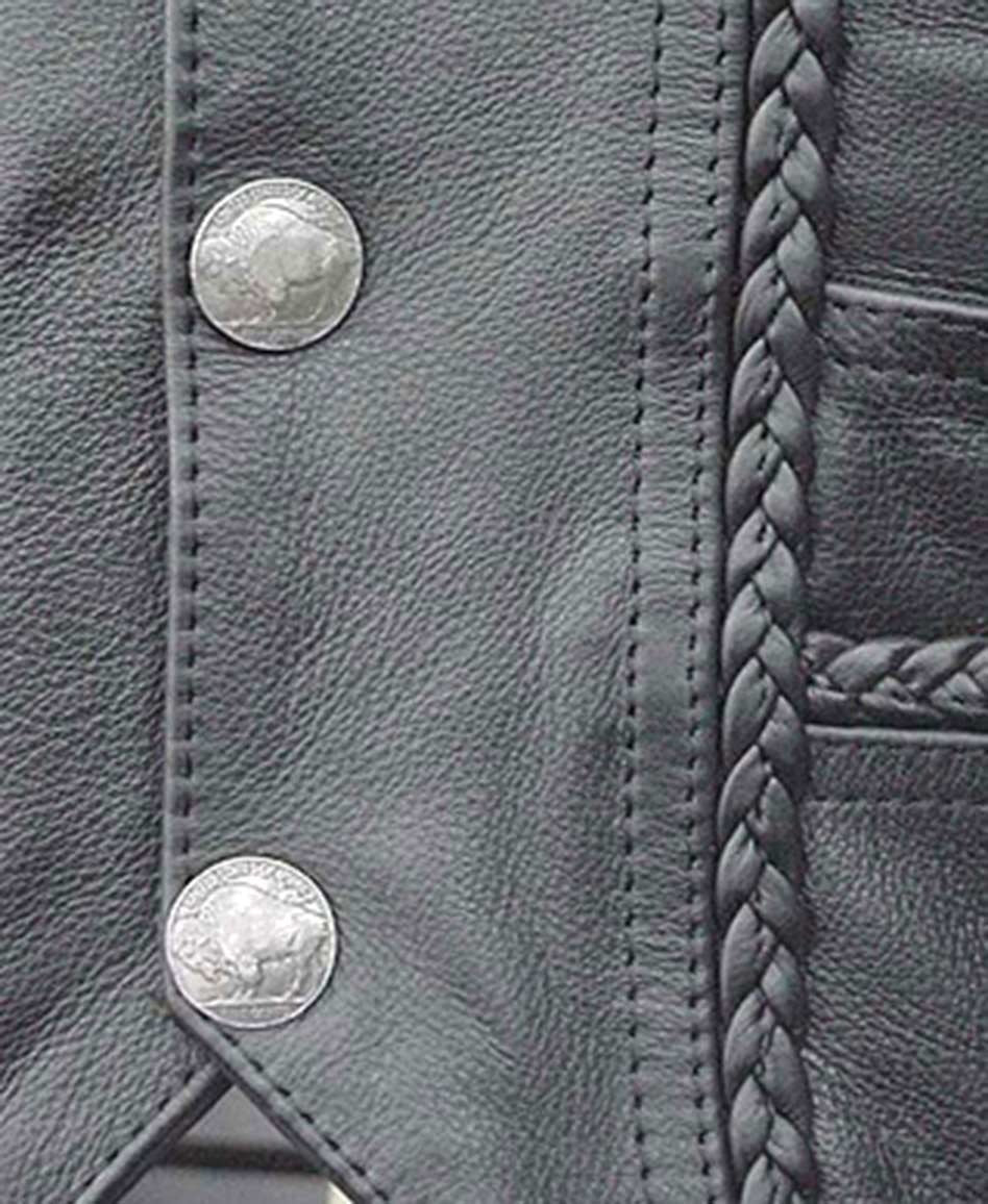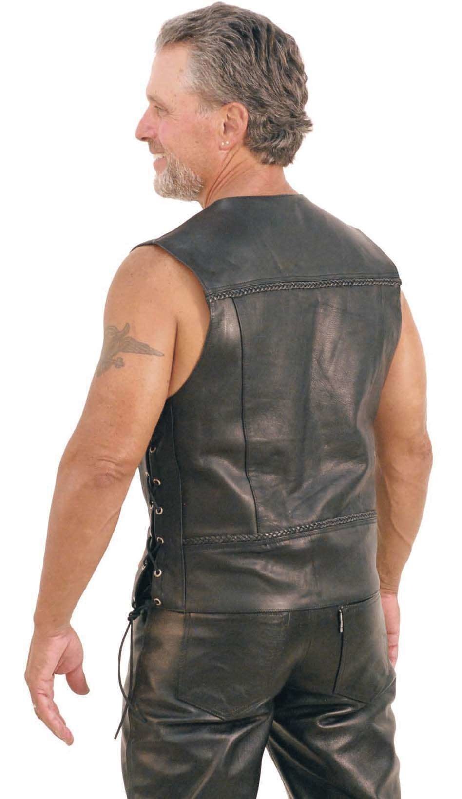 Leather vest with buffalo nickel snaps and side lacing in a butter soft, yet heavy, top grain Ultra Premium cowhide. This men's motorcycle vest is decorated nicely with mini braid trim. The adjustable side lacing is ideal for that after buffet dinner adjustment, or for those with club patches on back so you can wear over your jacket to show off your colors. A biker vest with other features including two front pockets, two inside chest pockets and a full nylon lining. A Jamin Leather® exclusive. Sizes: S, M, L, XL, 2X, 3X. +$10 for 2X-3X. [5#]