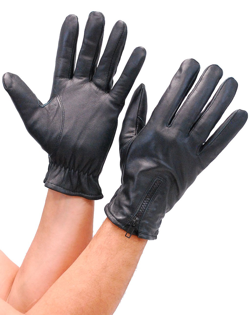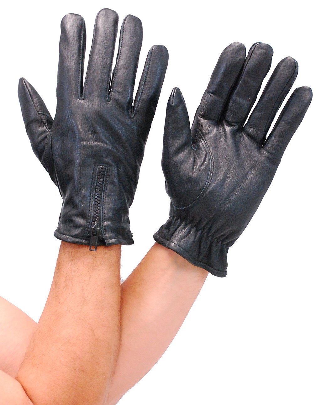 Premium cowhide leather driving gloves with zipper back that makes it easer to get on. A great pair of motorcycle driving gloves made of heavy duty, yet soft leather. These men's leather driving gloves are ideal driving gloves for your car or bike. These black leather gloves come with a heavy duty zipper on back so you can tighten it up at the wrist to keep it securely in place. Black leather gloves that also comes with an elastic stretch at wrist for improved fit. Classic driving gloves that have been a staple and necessity for all serious riders. Sizes: S, M, L, XL, 2X, 3X, all one price. [.5#]