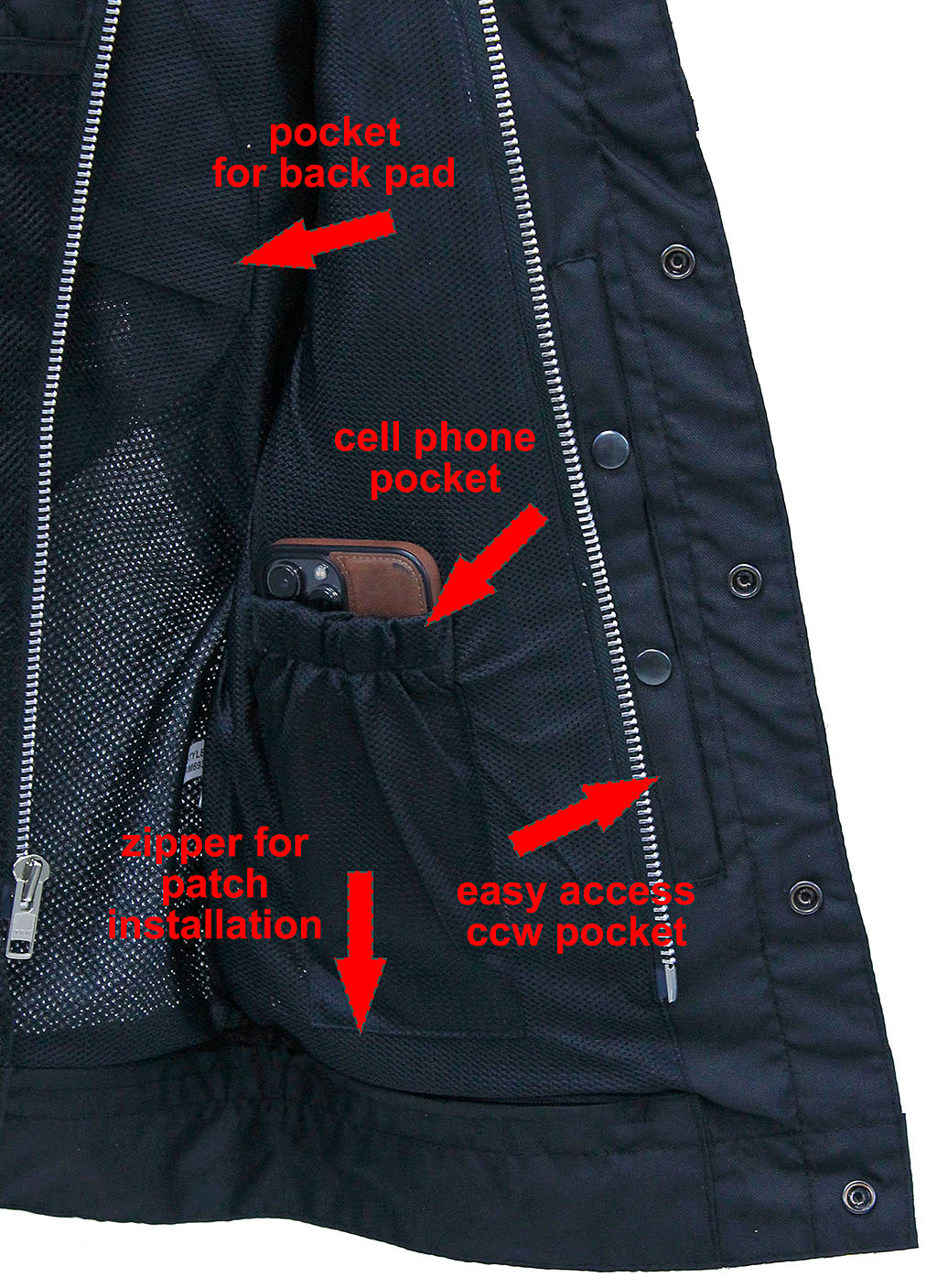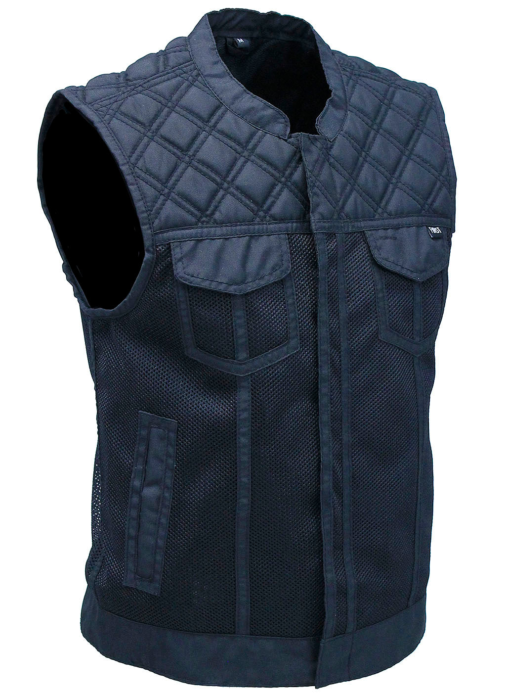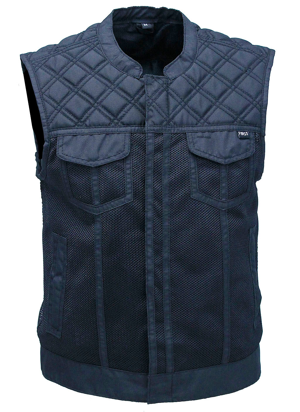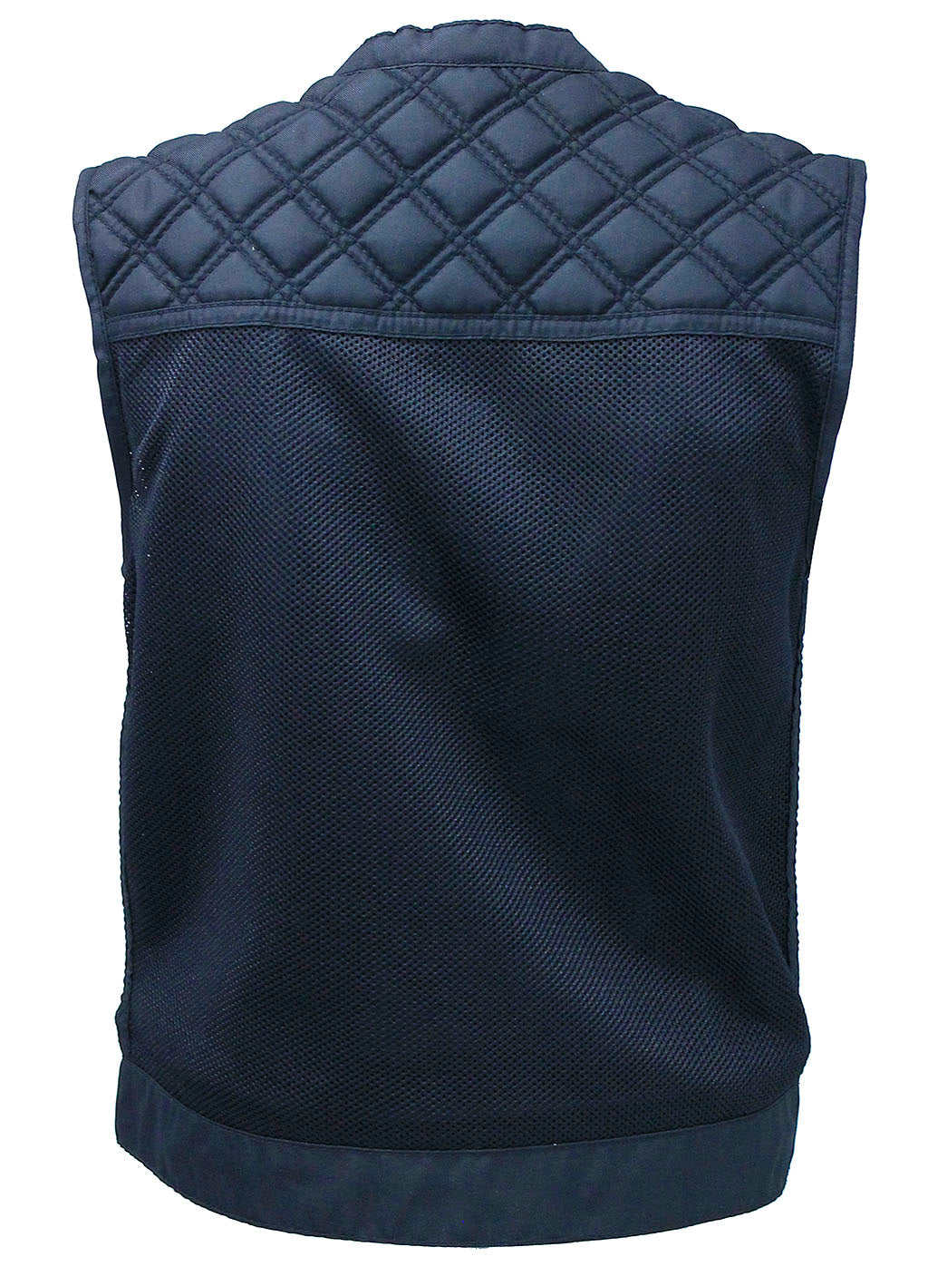 Lightweight nylon mesh biker cut with quilted shoulders, concealed pockets and zipper liners for patch installation. Classic style motorcycle vest ideal for hot weather riding with an easy access pocket behind the snap flap for right handed access to your phone or device. This breathable motorcycle vest includes two chest snap flap pockets, two bottom pockets, stand up mandarin collar, and a soft nylon mesh lining. Sizes: M, L, XL, 2X, 3X, 4X, 5X. +$10 for 2X-3X +$20 for 4X-5X. [5#]