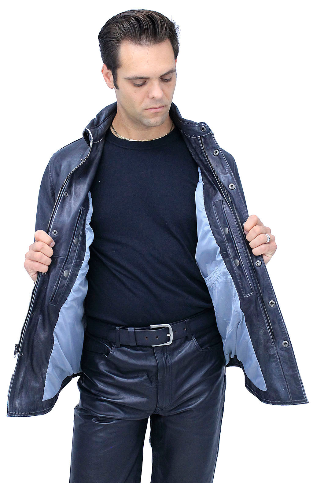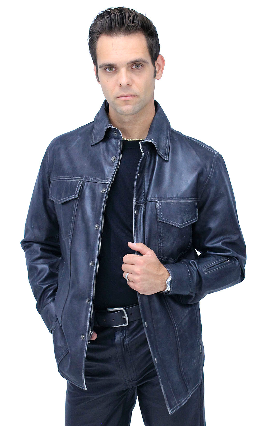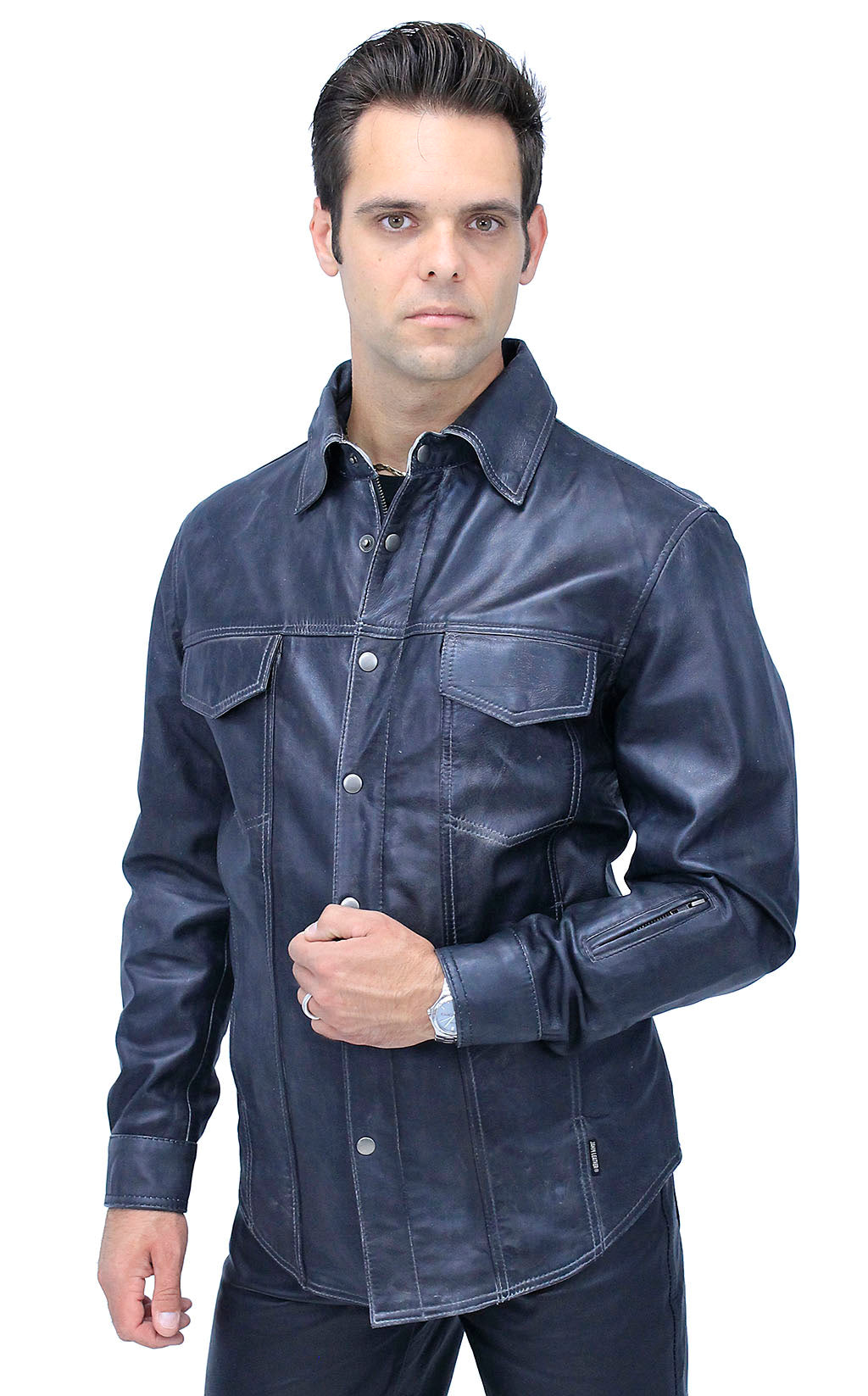 A men's gray leather shirt with a new gray antiqued finish for that well loved look. An amazingly comfortable men's gray shirt considered a lightweight leather jacket in premium soft lambskin leather. This lightweight leather shirt snaps and zips up front with features that include 2 front snap down chest pockets, 2 snap closed front belly pockets, adjustable double snap cuffs, long body style and a soft satin lining. Exclusive Jamin Leather® quality brand shirt. This men's leather shirt is impressive looking and ideal for any dinner party or important affair. Sizes: S-5X. +$10 for 2X-3X, +$20 for 5X. [5#]